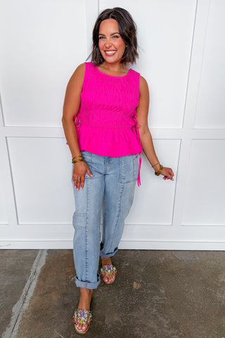 The Color Pop Cutie Peplum Top is your go-to for bright, feel-good style. Designed with a smocked bodice for a flattering, comfortable fit, this top features playful tie bows on the sides and a flirty peplum hem that adds the perfect feminine touch. Available in multiple bold colors, it’s the ultimate statement piece for sunny days, whether you’re dressing it up or keeping it casual.