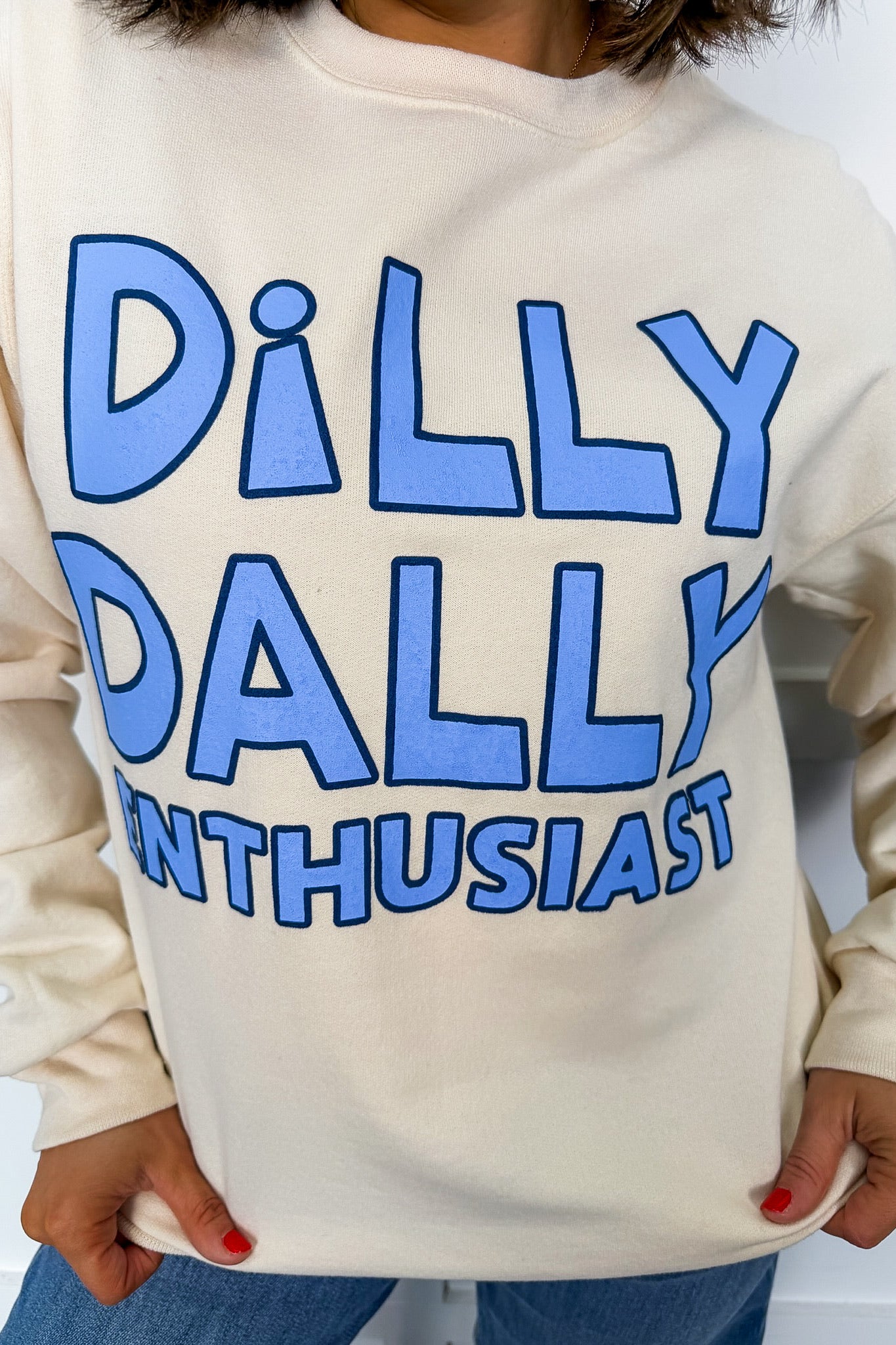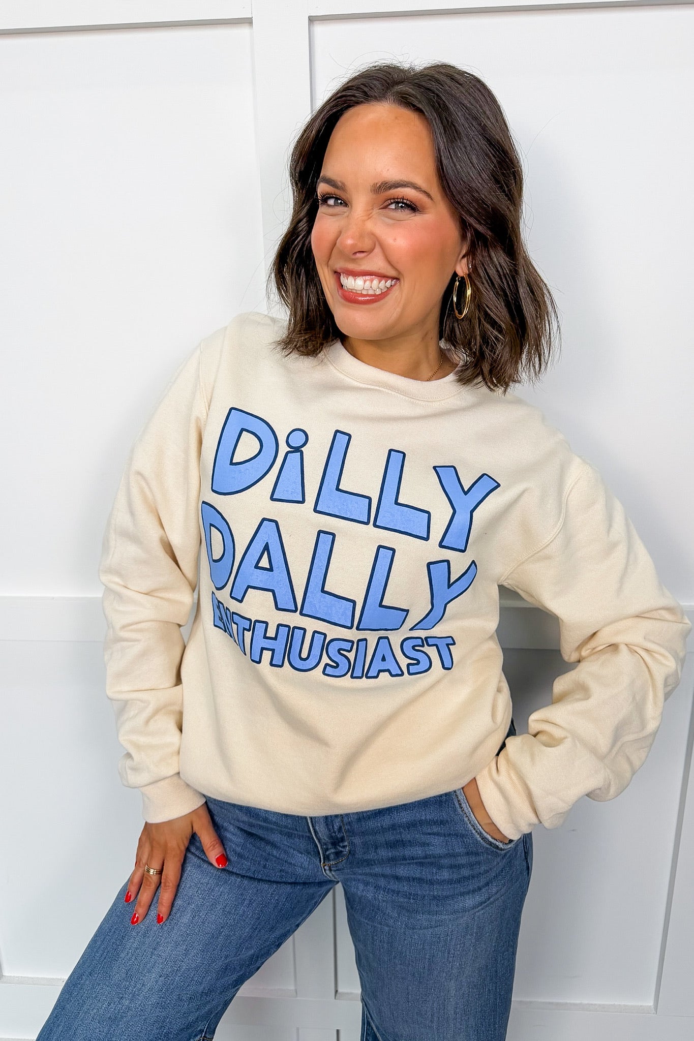 Your new favorite cozy statement piece! The Dilly Dally Enthusiast Sweatshirt brings playful charm with bold sky-blue lettering on a soft cream base. Designed for laid-back days, errands, coffee runs, and couch lounging — this sweatshirt is all about comfy vibes with personality.