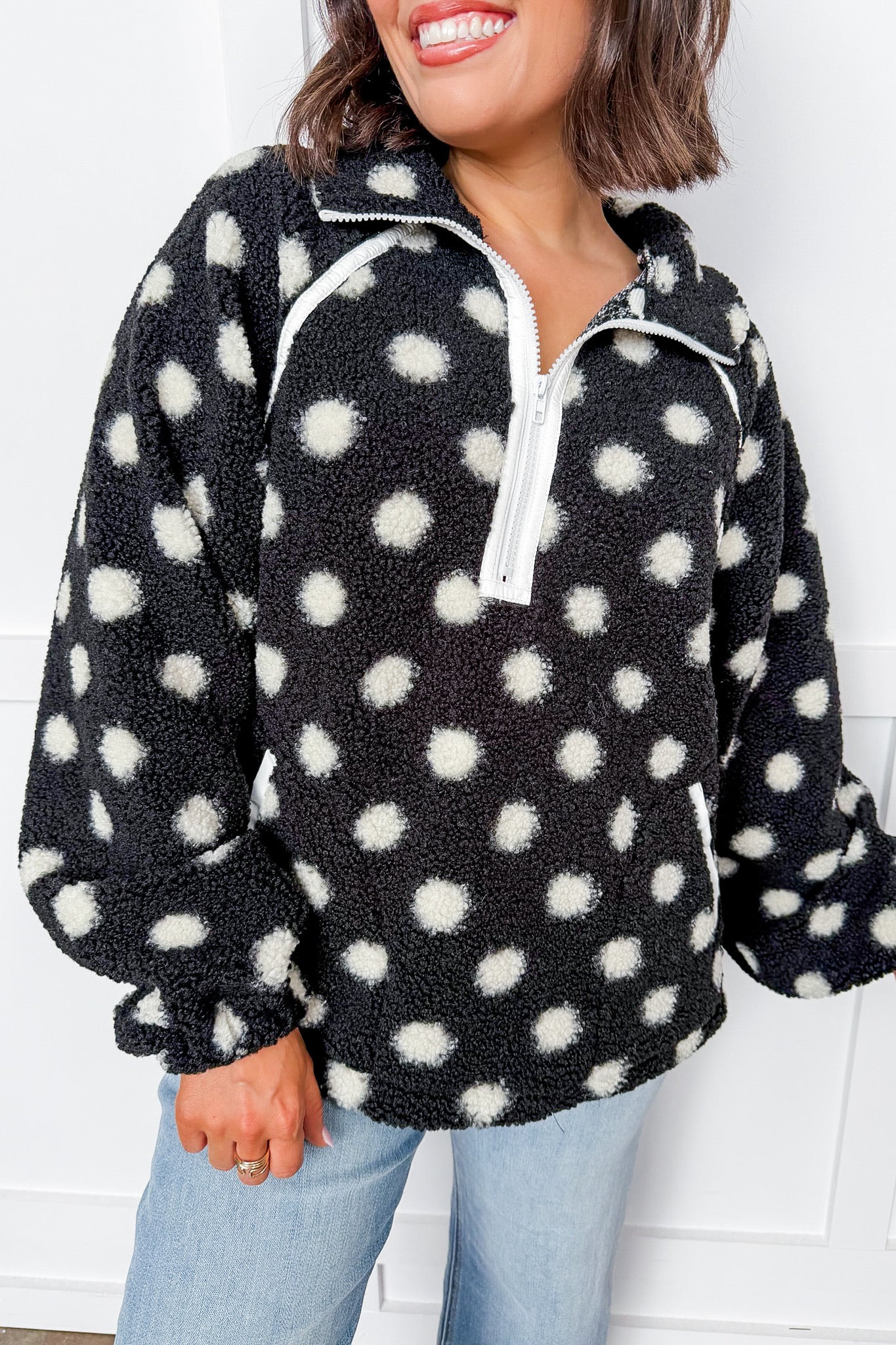 Stay cute and cozy all season long in our Polka-Dot Sherpa! This ultra-soft pullover blends playful style with effortless comfort. Featuring white polka dots on a black sherpa base, a functional half-zip neckline, and roomy sleeves—this piece is made for chilly mornings, coffee runs, and everything in between. Just throw it on and instantly look put-together while feeling like you're wrapped in a blanket!