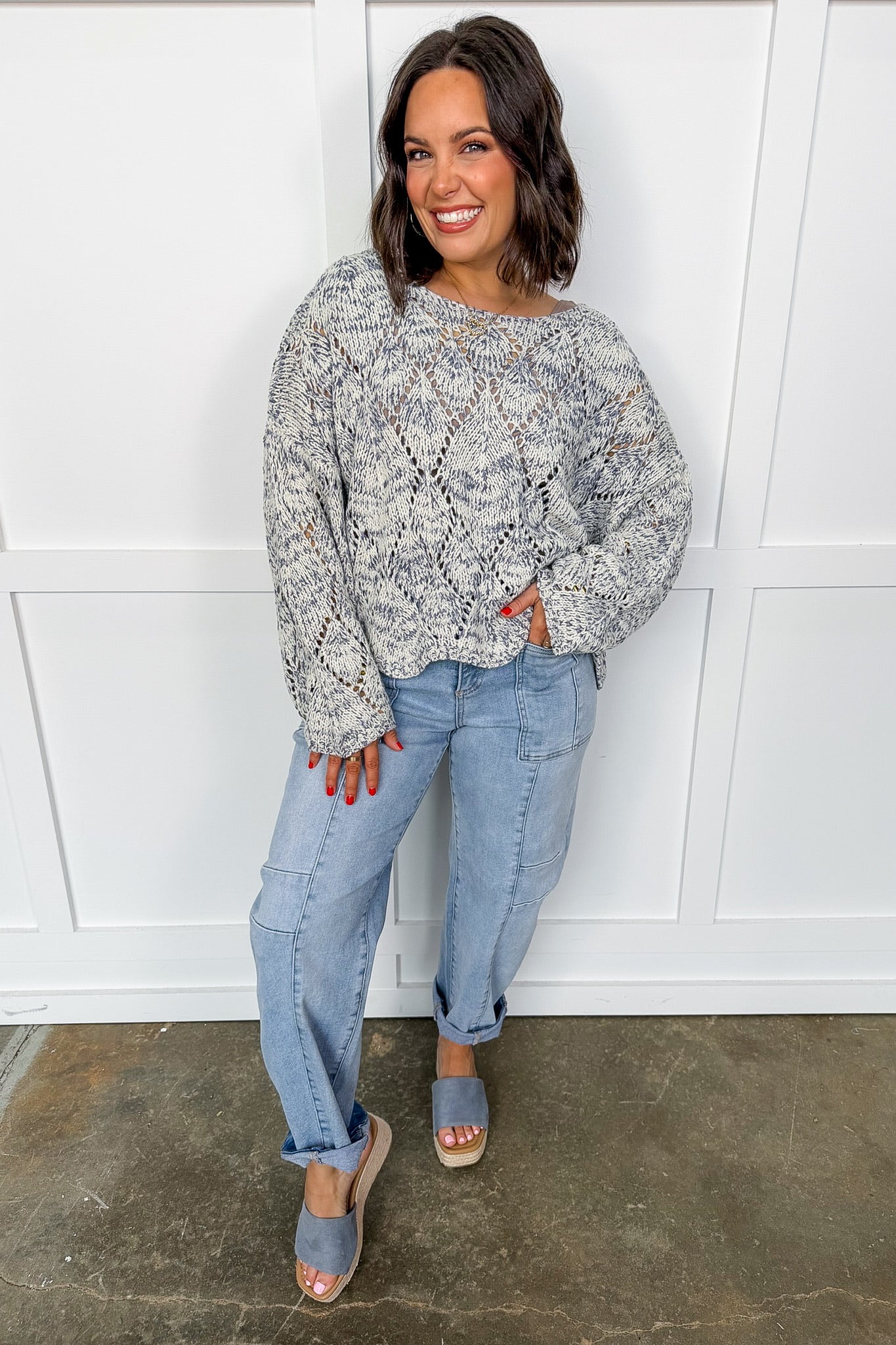 Light, airy, and effortlessly chic, its the perfect blend of cozy and flirty. Designed with an open-knit pattern and a relaxed, slightly cropped silhouette, this sweater adds texture and softness to any outfit. The subtle silver tone and breathable knit make it ideal for layering over tanks, bralettes, or swim tops—perfect for transitioning seasons and casual days with a feminine touch.