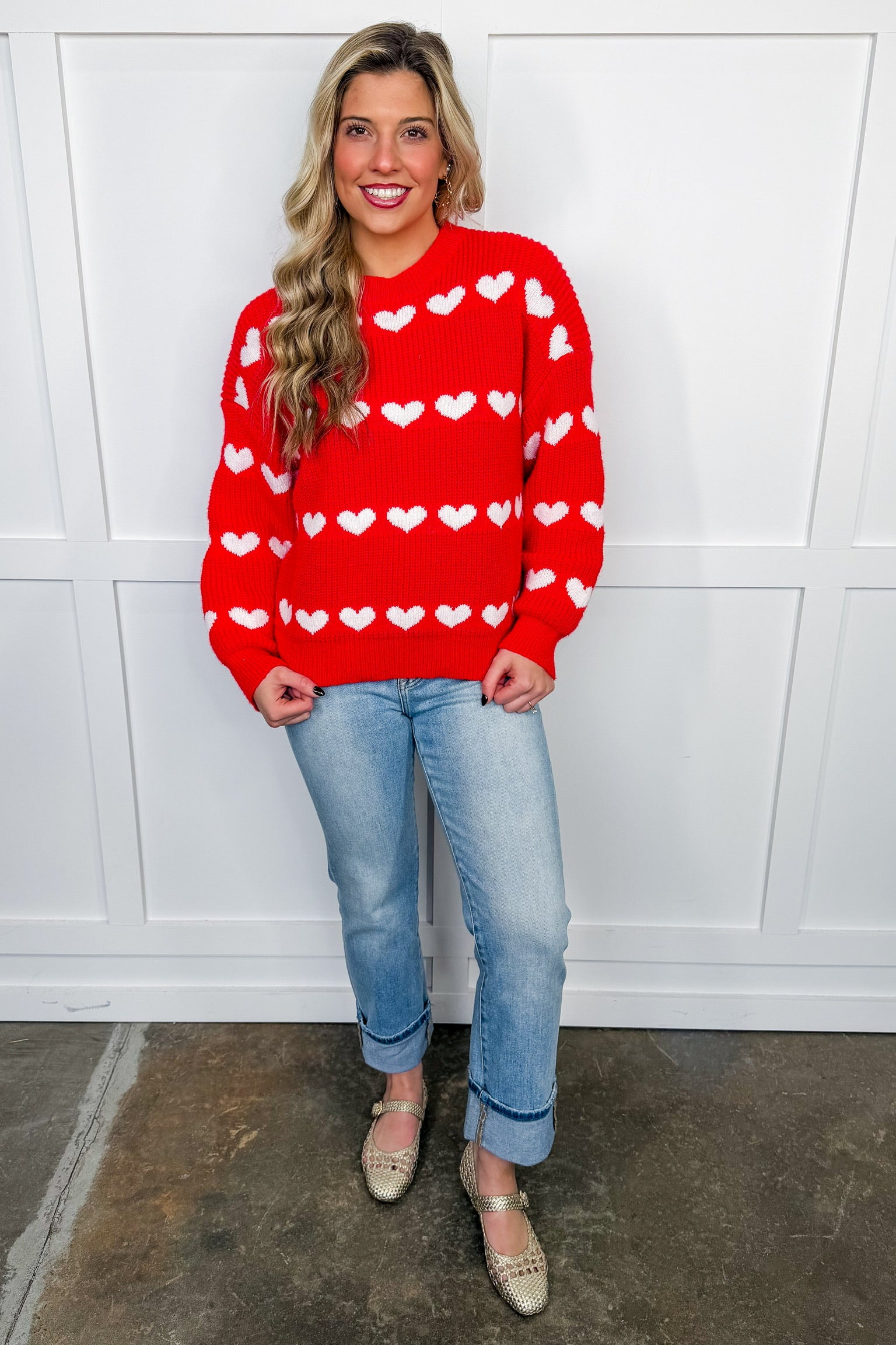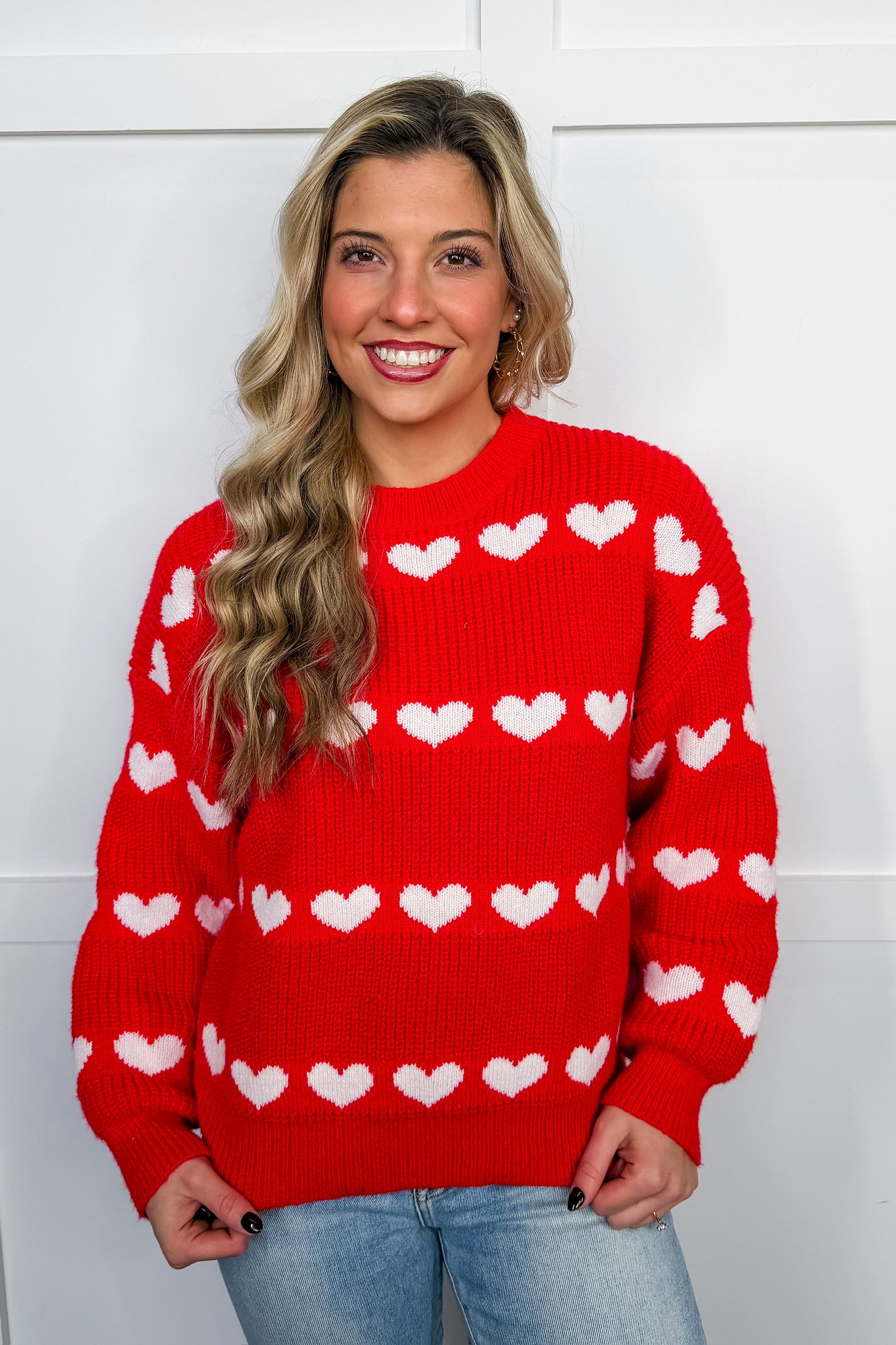 Wrap yourself in adorable charm with our Sweetheart Stroll Sweater! This cozy red knit is sprinkled with rows of bold white hearts, creating the perfect playful-yet-chic look. Designed with a relaxed fit and soft yarn, it’s the ideal pick for Valentine’s season, girls’ nights, coffee dates, or anytime you feel like showing a little love. Pair it with leggings, denim, or a cute mini skirt for the sweetest outfit ever!