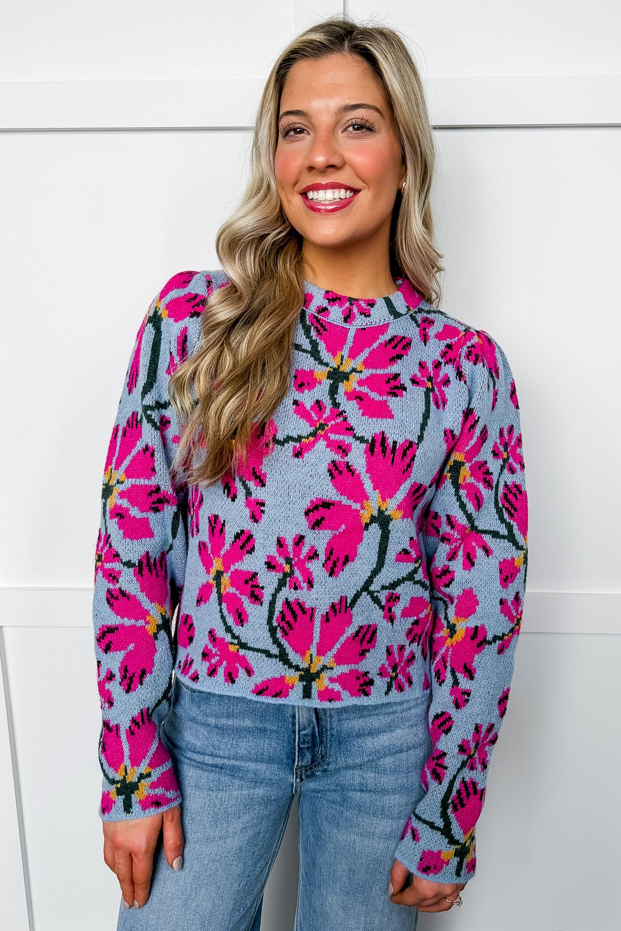 Bold, blooming, and beautifully cozy — this floral knit sweater is made for the girl who loves to stand out. With a vibrant allover flower print and a relaxed fit that gives effortless personality, she’s the perfect statement knit for coffee runs, boutique strolls, or brightening up a cold winter day. Pair with denim and boots now, shorts in spring later — it’s a year-round mood booster.