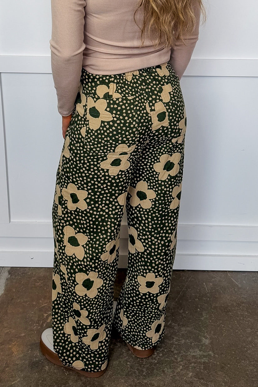 Step into playful charm with these retro-inspired floral pants! Featuring an all-over cream daisy print on a sage green base, these wide-leg trousers bring comfort and personality together effortlessly. High-rise with a relaxed flow, they’re perfect for coffee runs, spring outings, or pairing with a cozy sweater tucked in. Style with sneakers for everyday casual or dress up with a blouse and sandals for a chic standout look.