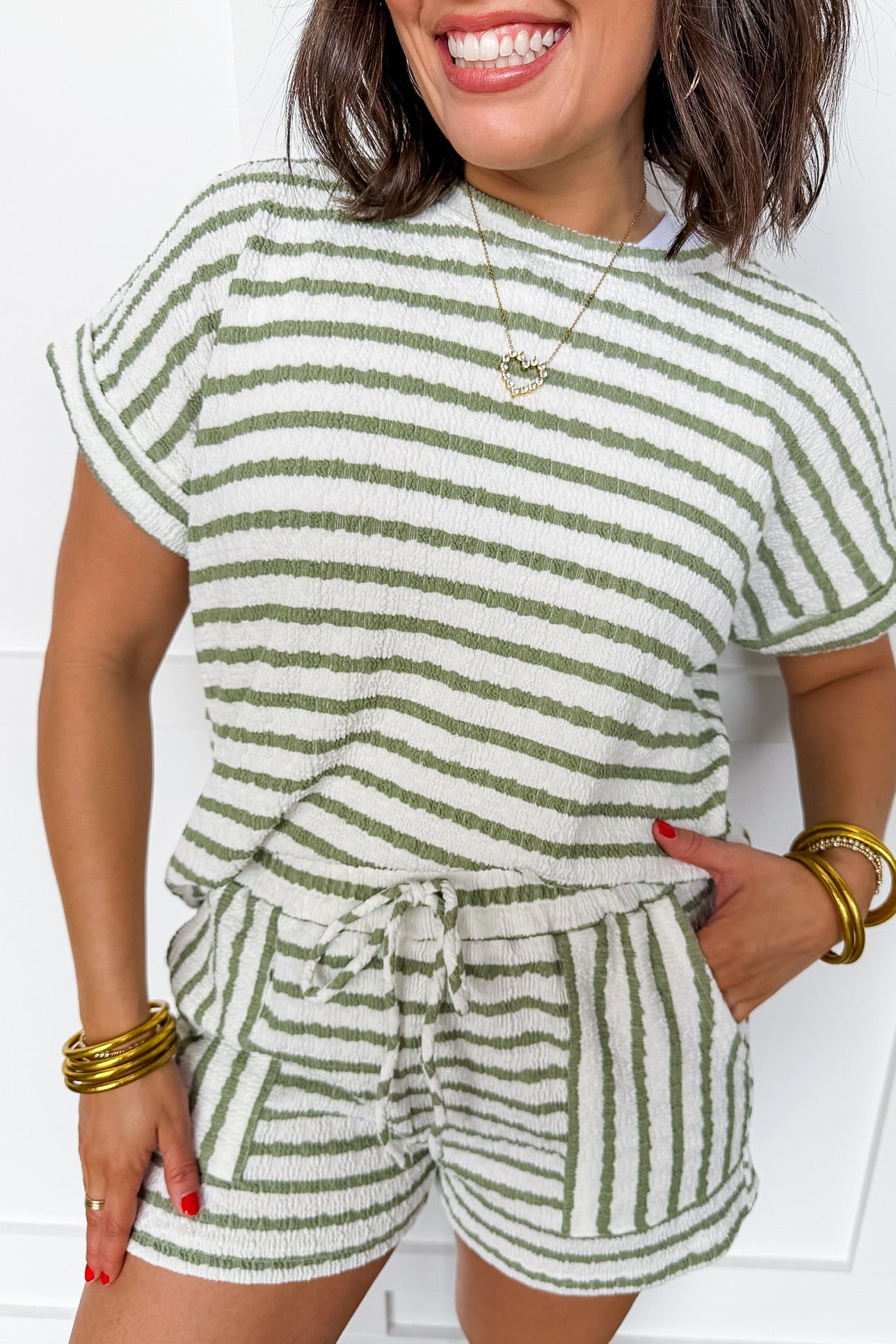 Meet the Off Duty Striped Shorts — the cutest relaxed bottom for comfy days, lazy mornings, and everything in between. Designed with an elastic drawstring waistband for the perfect fit, plus side pockets for that casual everyday feel. These shorts pair perfectly with the matching Off Duty Striped Tee or lounge pants for a complete mix-and-match look — or wear them solo with a basic tank for an effortless summer vibe. Soft, breathable, and easy to throw on, they’ll be your new go-to short for errands, weekends, or lounging at home.