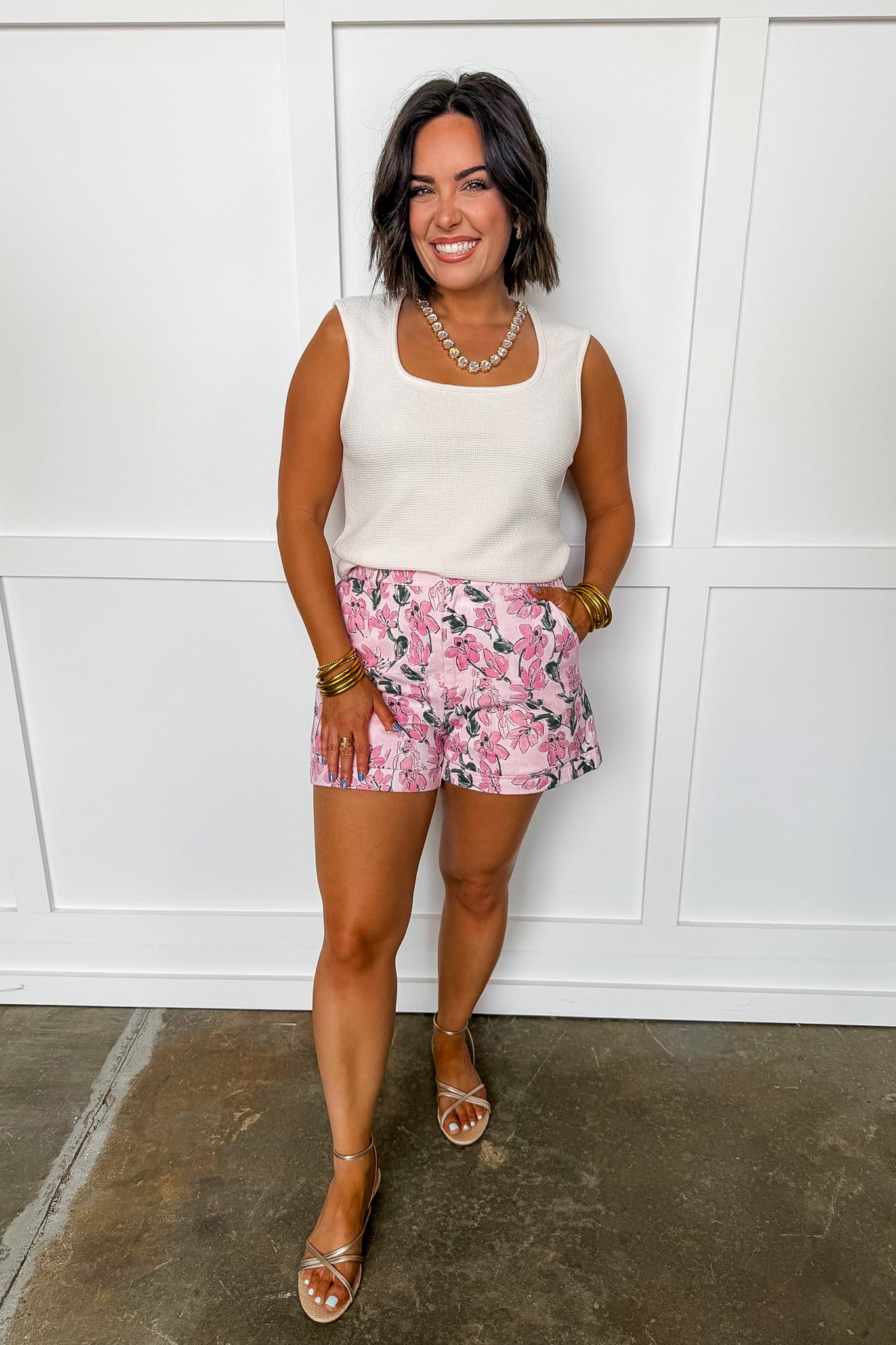 Chic, feminine, and effortlessly polished, the Pink Floral Soirée Shorts bring a swanky, elevated touch to your warm-weather wardrobe. Designed in a beautiful pink floral jacquard fabric, these shorts have a subtle textured finish that adds depth and sophistication to the look. The tailored silhouette creates a flattering, polished fit while still feeling comfortable and easy to wear. Perfect for brunch dates, garden parties, or summer soirées, these shorts instantly elevate any outfit. Pair them with a simple blouse for an effortlessly chic look or dress them up with the matching top for a statement set.
