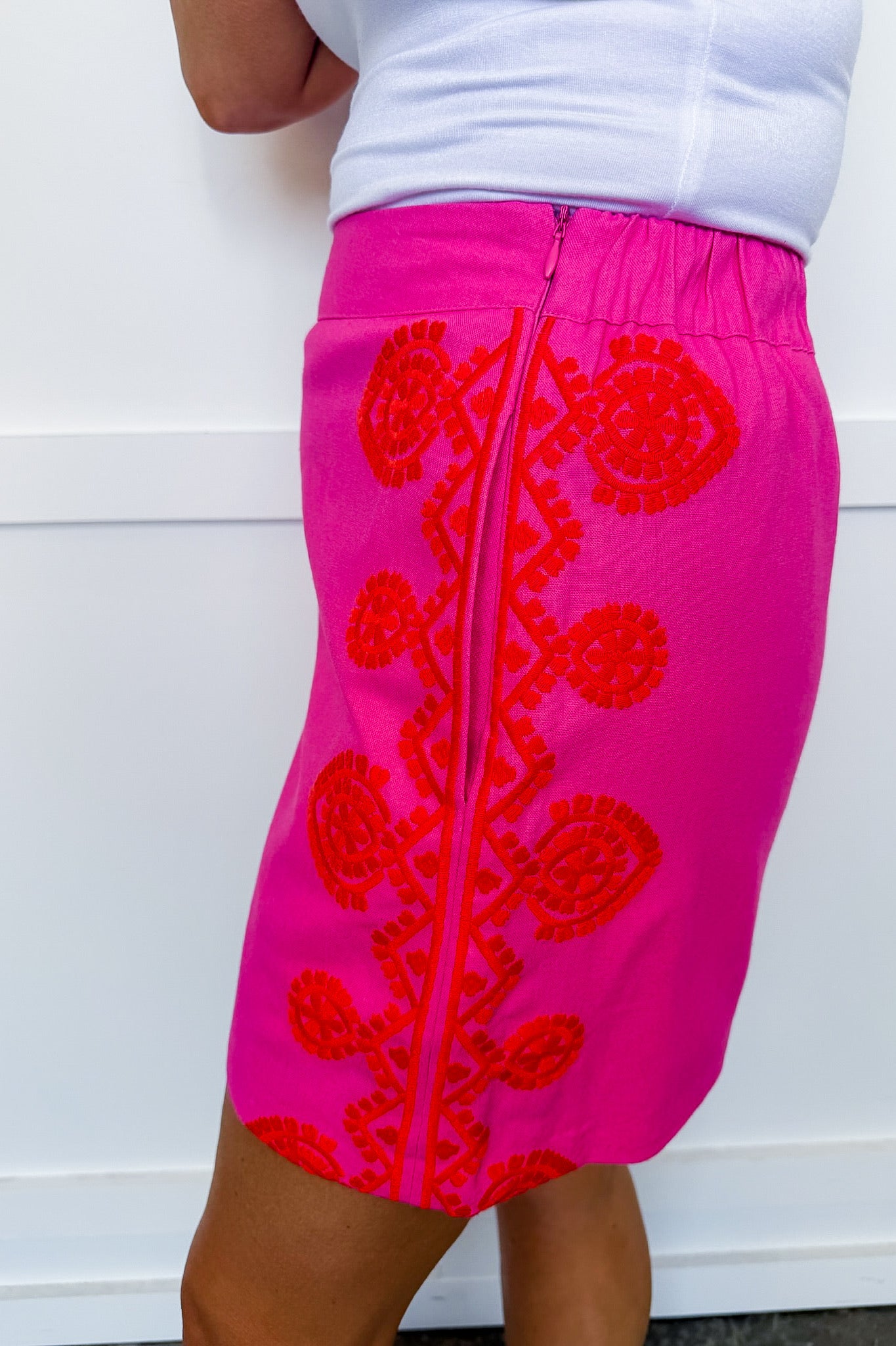 Bright, bold, and perfect for sunny days, The Palm Cove Embroidered Skirt adds a playful pop of color to your warm-weather wardrobe. Featuring vibrant pink fabric with beautiful tonal embroidery along the side, this skirt brings a polished yet fun look that’s perfect for spring and summer.