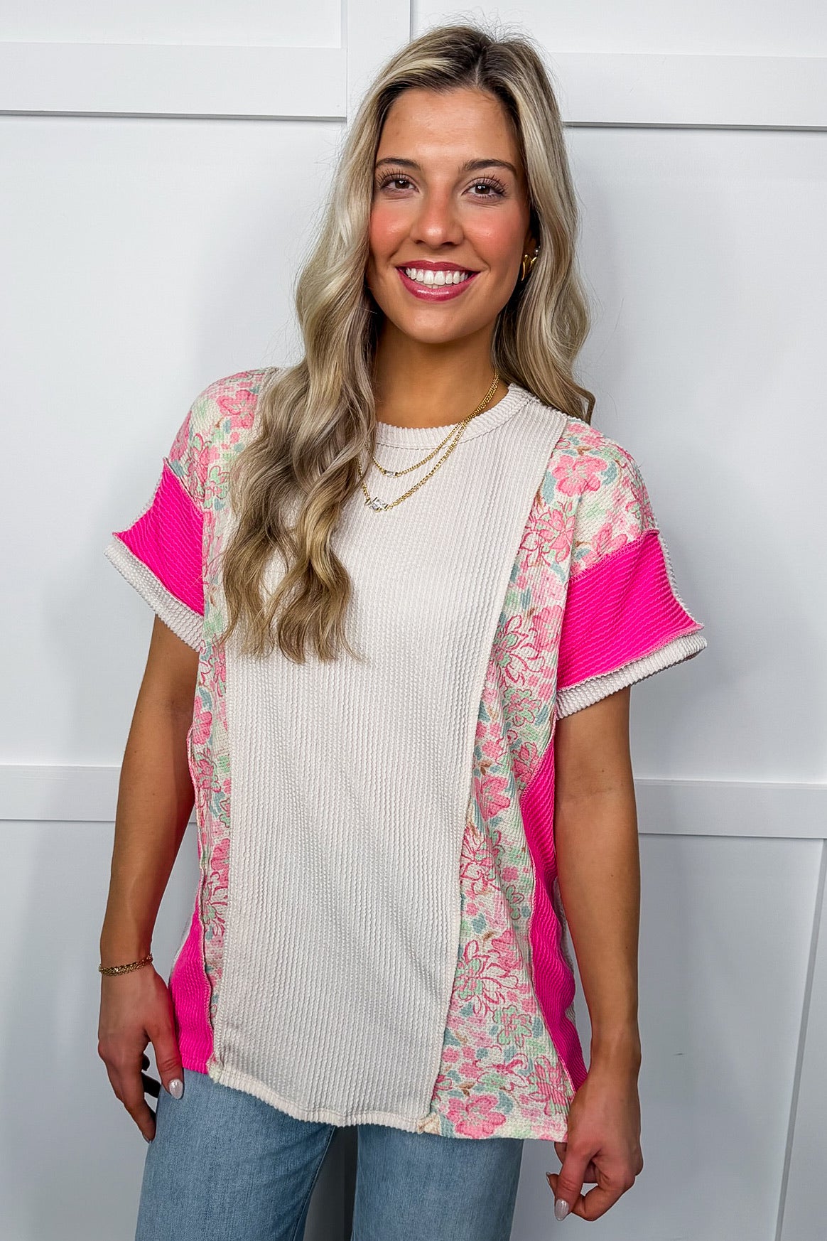This cute casual tee mixes a soft tan waffle knit body with bold pink patchwork floral panels for the perfect playful statement. Relaxed, lightweight, and effortlessly cute — pair with denim shorts for everyday, or dress it with white jeans + sandals for brunch.