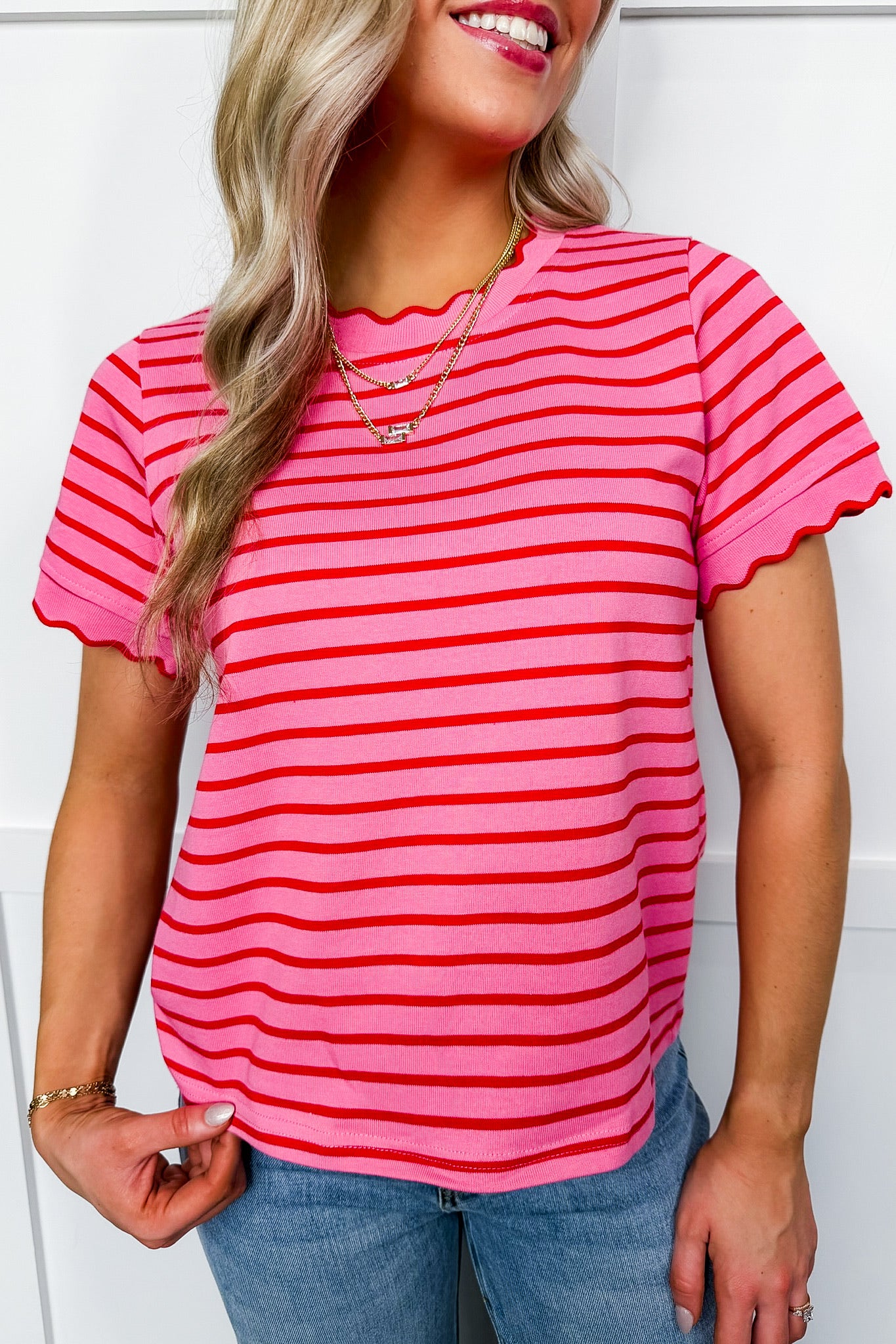 The Sweet Stripe Scallop Edge Tee is your new everyday essential with a playful twist. Featuring soft pink fabric with bold red stripes and delicate scallop-edge trim, this tee adds just the right amount of charm to a classic silhouette. Lightweight, stretchy, and easy to style, it’s perfect for layering or wearing on its own for a pop of color.