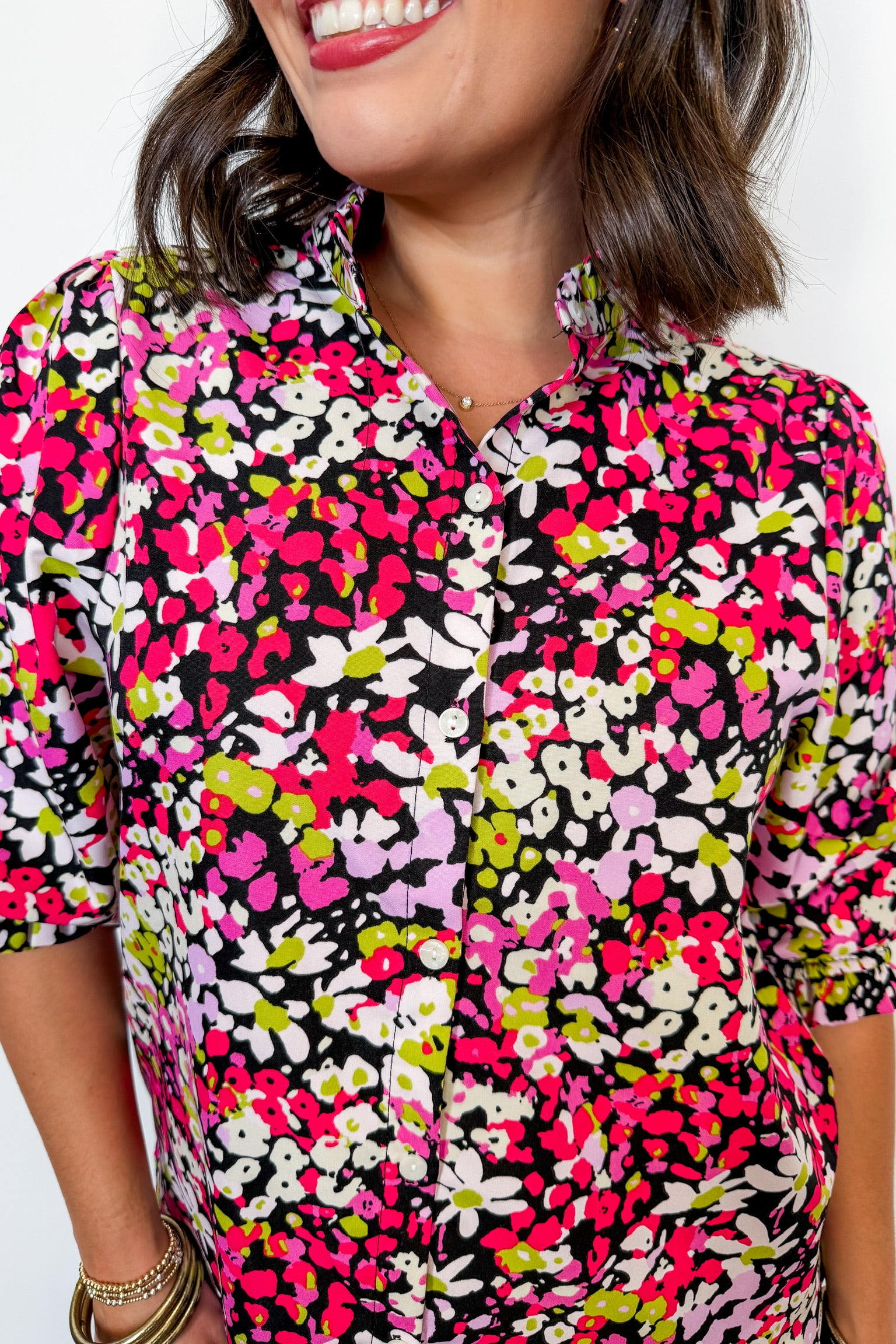 Bold, colorful, and oh-so-fun — The statement piece your closet’s been waiting for. Featuring a lively floral print with pops of pink, purple, and yellow, this top adds instant cheer to any outfit. Pair it with denim for casual days or tuck it into trousers for a fresh office look.