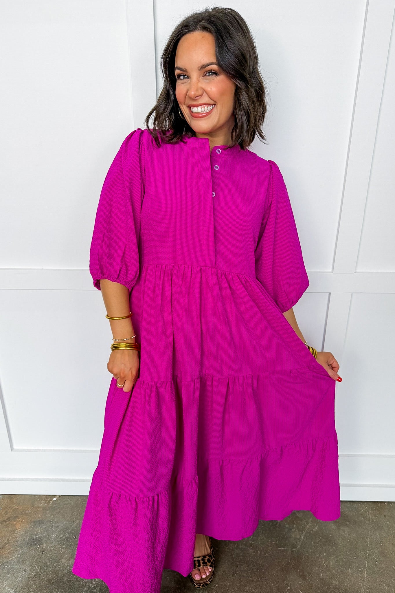 Twirl in this enchanting maxi dress featuring three-quarter sleeves that hit just right. The effortlessly flowing silhouette moves with you, creating that dreamy, graceful vibe perfect for making an entrance. Whether you're heading to a special occasion or just want to feel fabulous, this piece delivers elegance with a fun, carefree spirit.