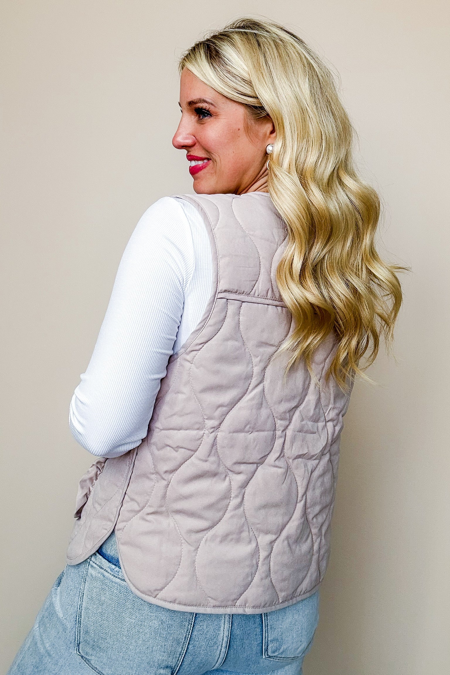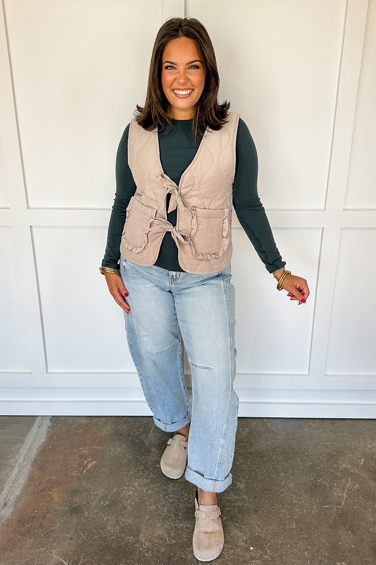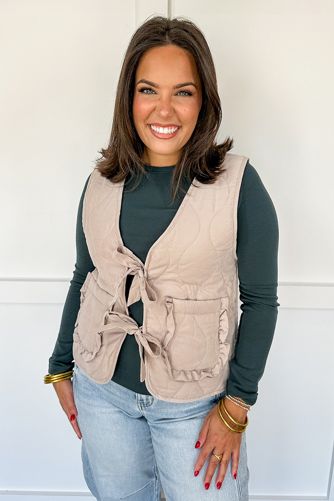 Stay cozy and stylish with the Autumn Escape Taupe Puffy Vest! Featuring a playful front tie closure and a flattering V-neck, this sleeveless vest is perfect for layering over your favorite tops. Keep your hands warm or stash essentials in the handy pockets. Available in multiple colors, it’s an easy way to add a pop of fun to your fall wardrobe.