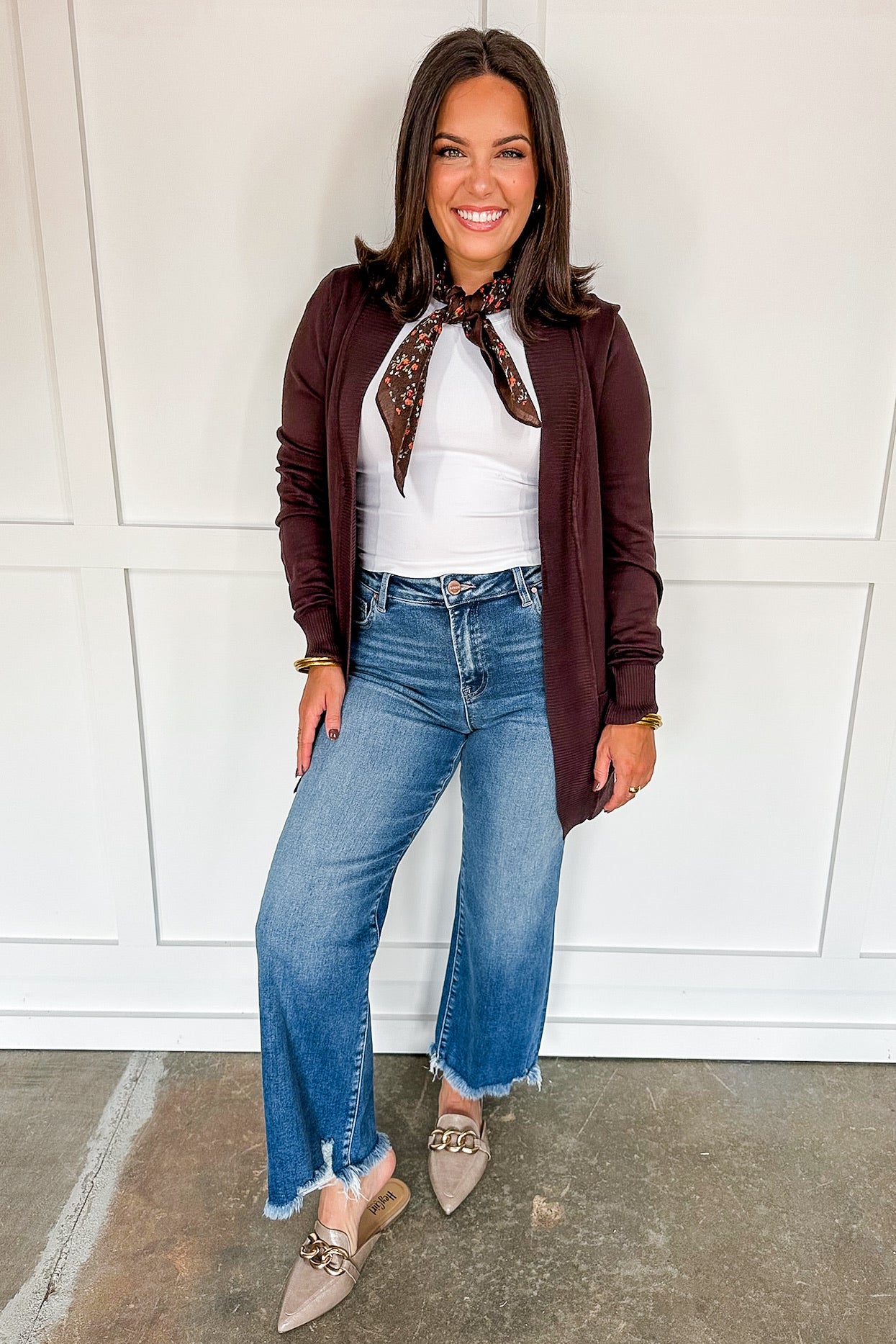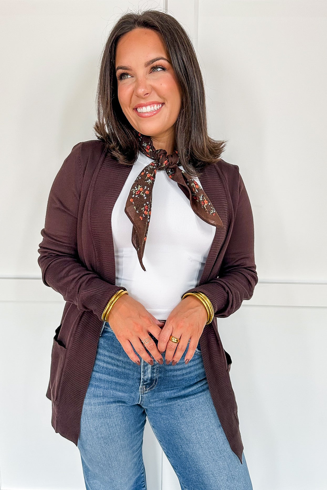 Cozy up in the Full of Grace Long Open Cardigan in Brown! With fitted long sleeves and handy front pockets, it’s your go-to layer for effortless style. Just throw it on and instantly add a touch of laid-back charm to any outfit. Perfectly long for extra comfort and a flattering fit, this cardigan makes casual feel fun.