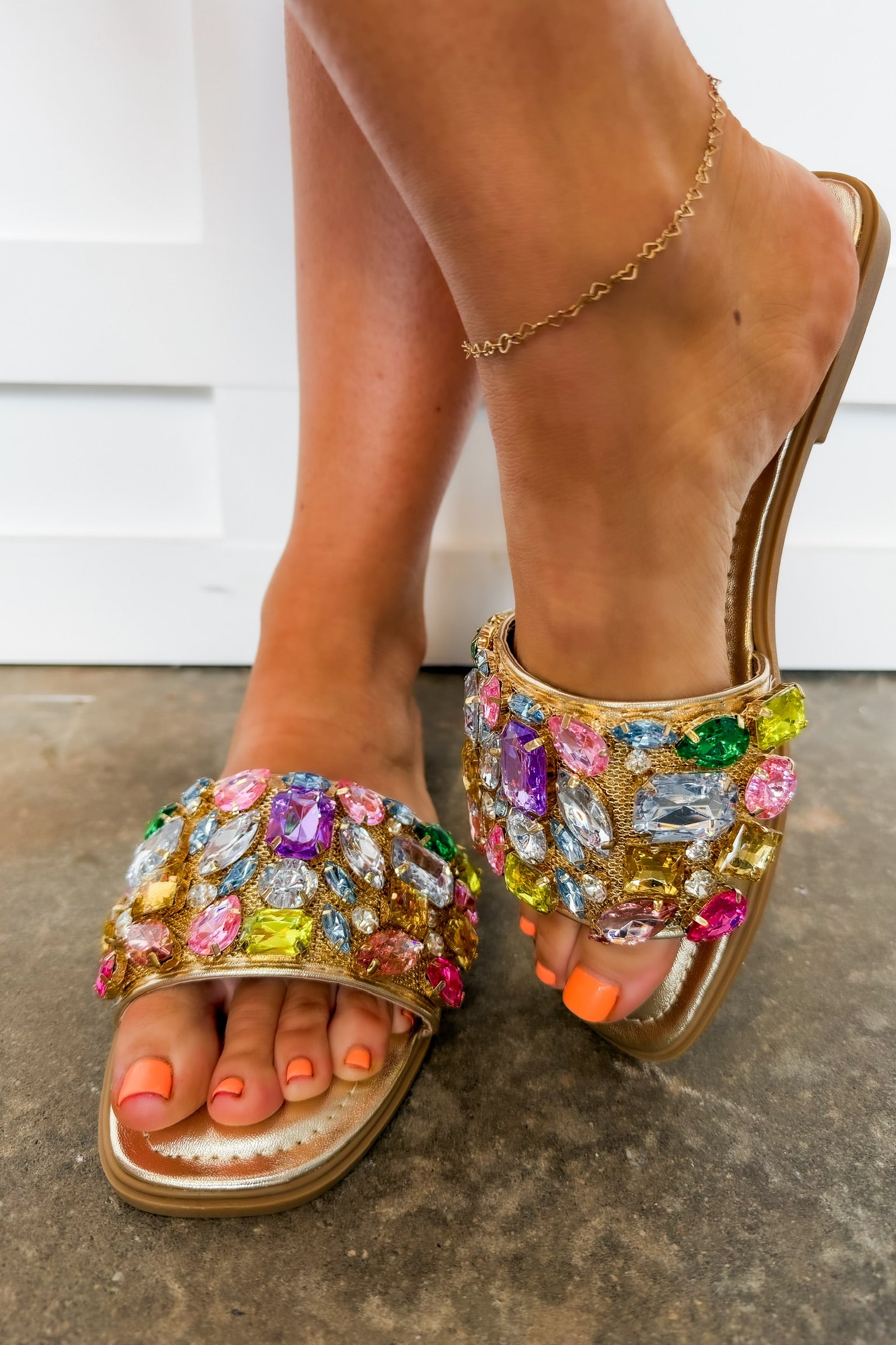 Turn heads wherever you go with the Uptown Chic Metallic Sandal in Pastel Gemstone. Designed to sparkle with every step, this slip-on sandal features a luxe metallic base and a bold strap adorned with colorful gemstone embellishments. Equal parts playful and polished, it’s the perfect statement shoe to elevate any outfit—from casual denim to dressy summer looks. Easy to wear and impossible to miss, this sandal brings instant glam to your wardrobe.