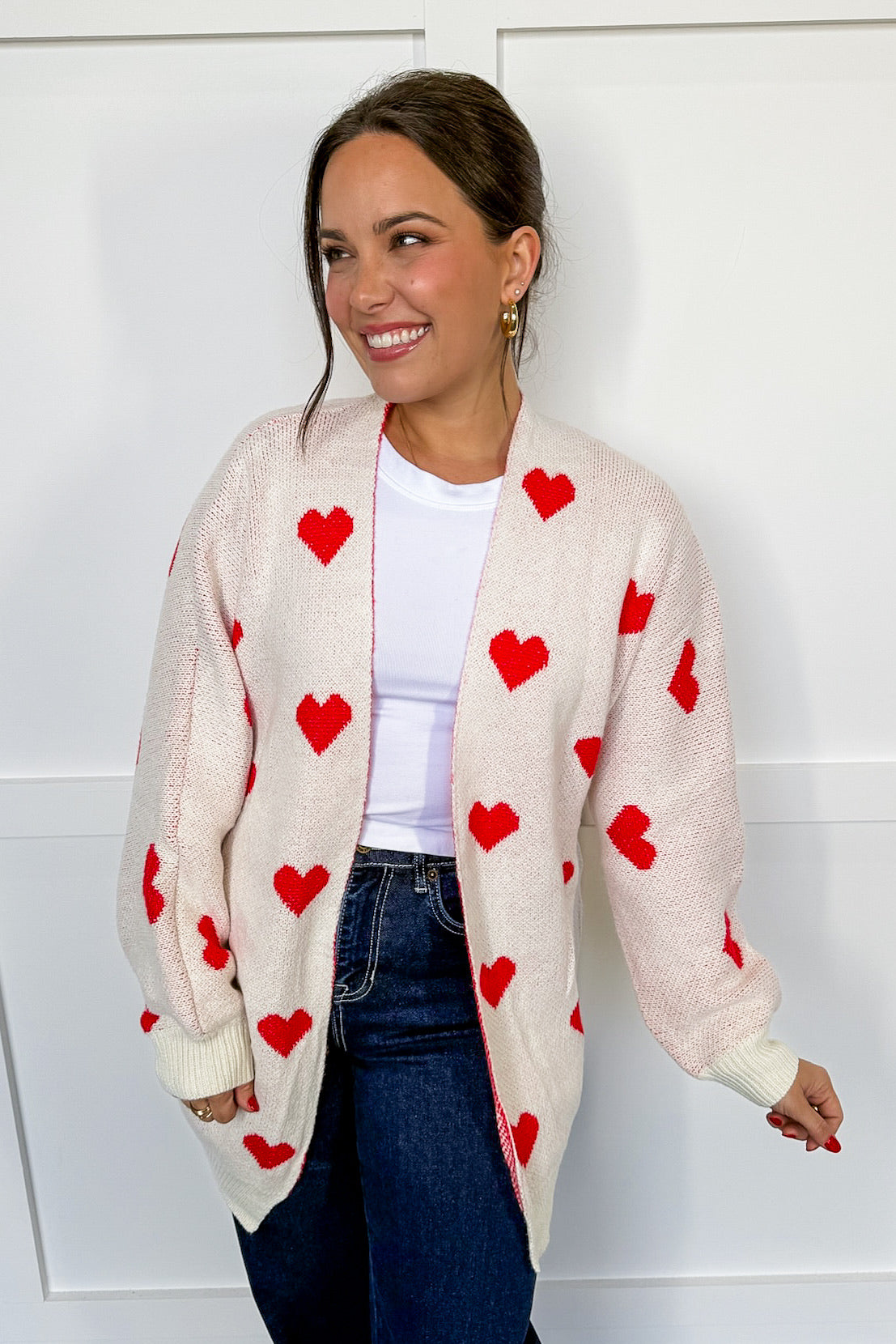 Fall head over heels for this charming Heart Print Cardigan! Designed with an ultra-soft knit and scattered red hearts, this piece adds the perfect dose of cozy romance to any outfit. Whether you're layering it over a tee, tank, or dress, this cardigan brings effortless sweetness and warmth all season long.