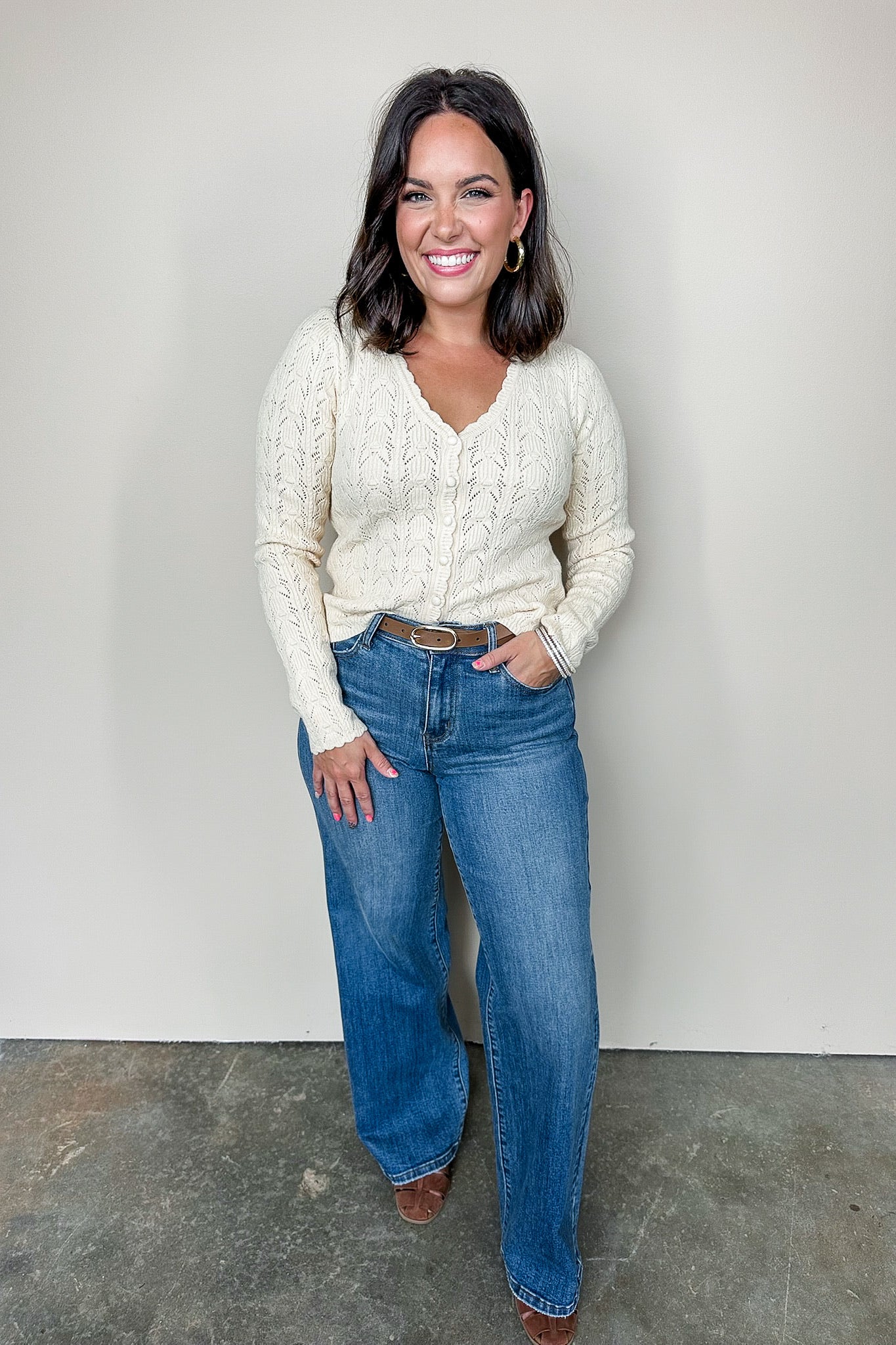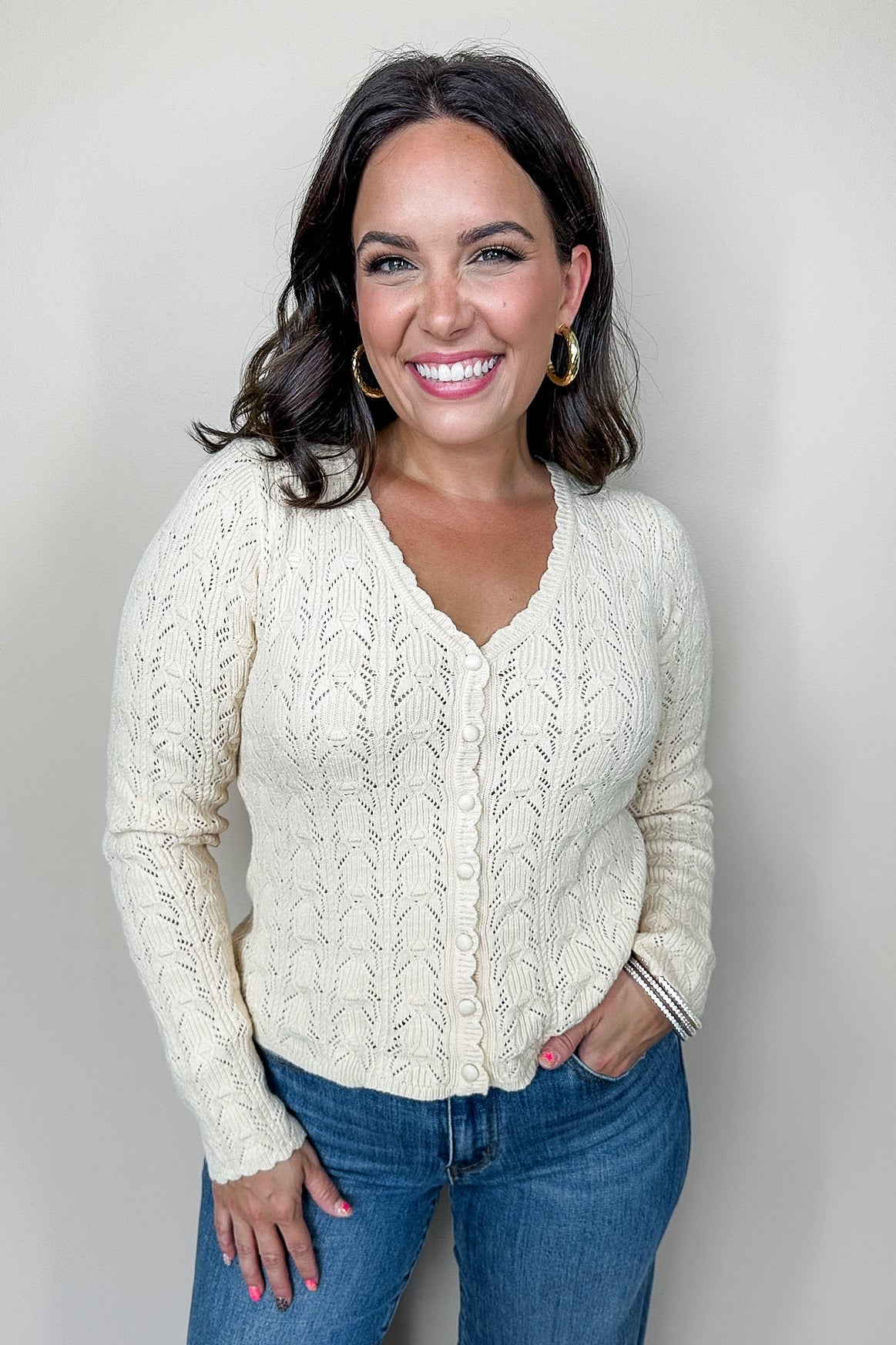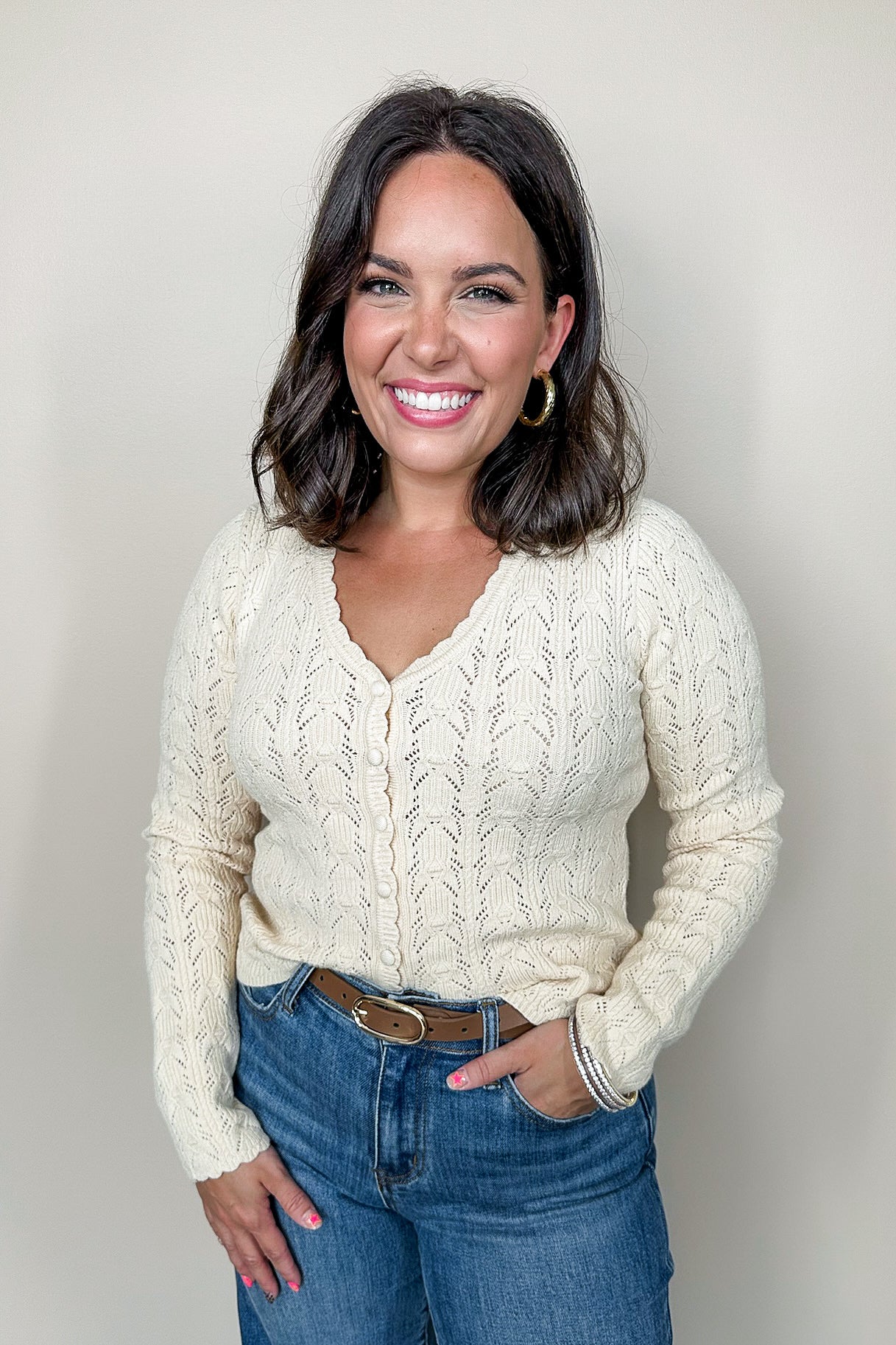 This cozy knit cardigan features a playful eyelet detail that adds a touch of charm to your look. With its fitted silhouette, V-neckline, and button-down front, it’s perfect for layering over your favorite tops. The long sleeves keep you comfortably covered while letting your style shine through.