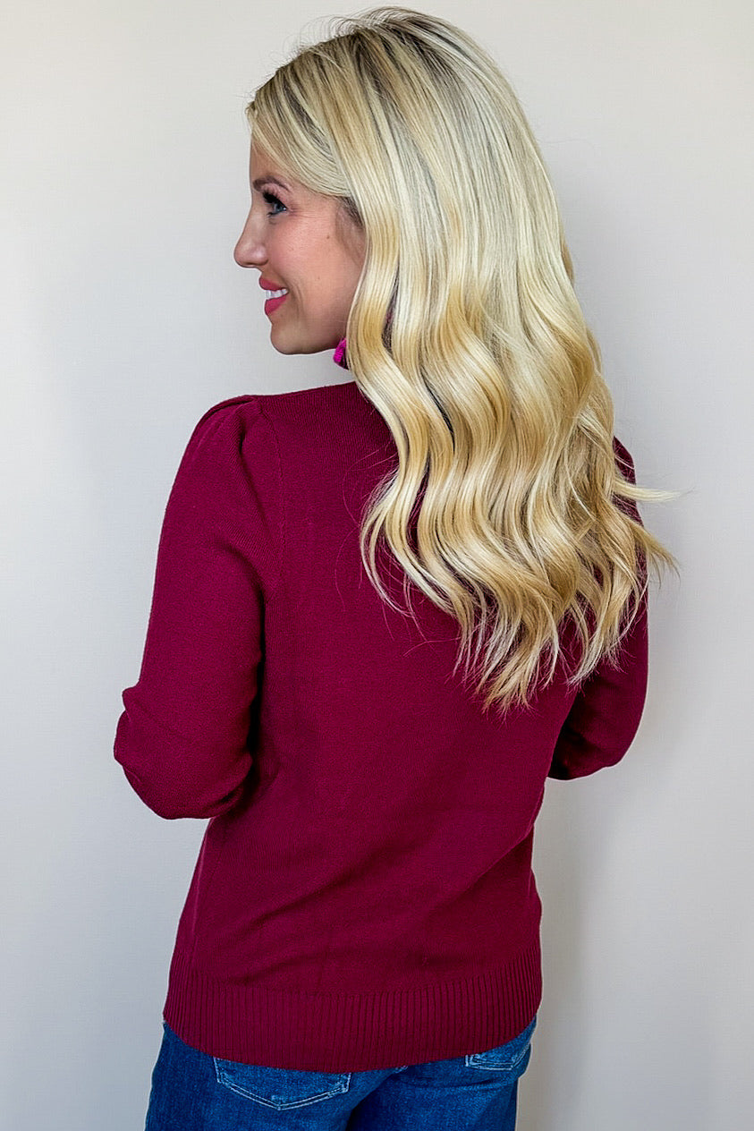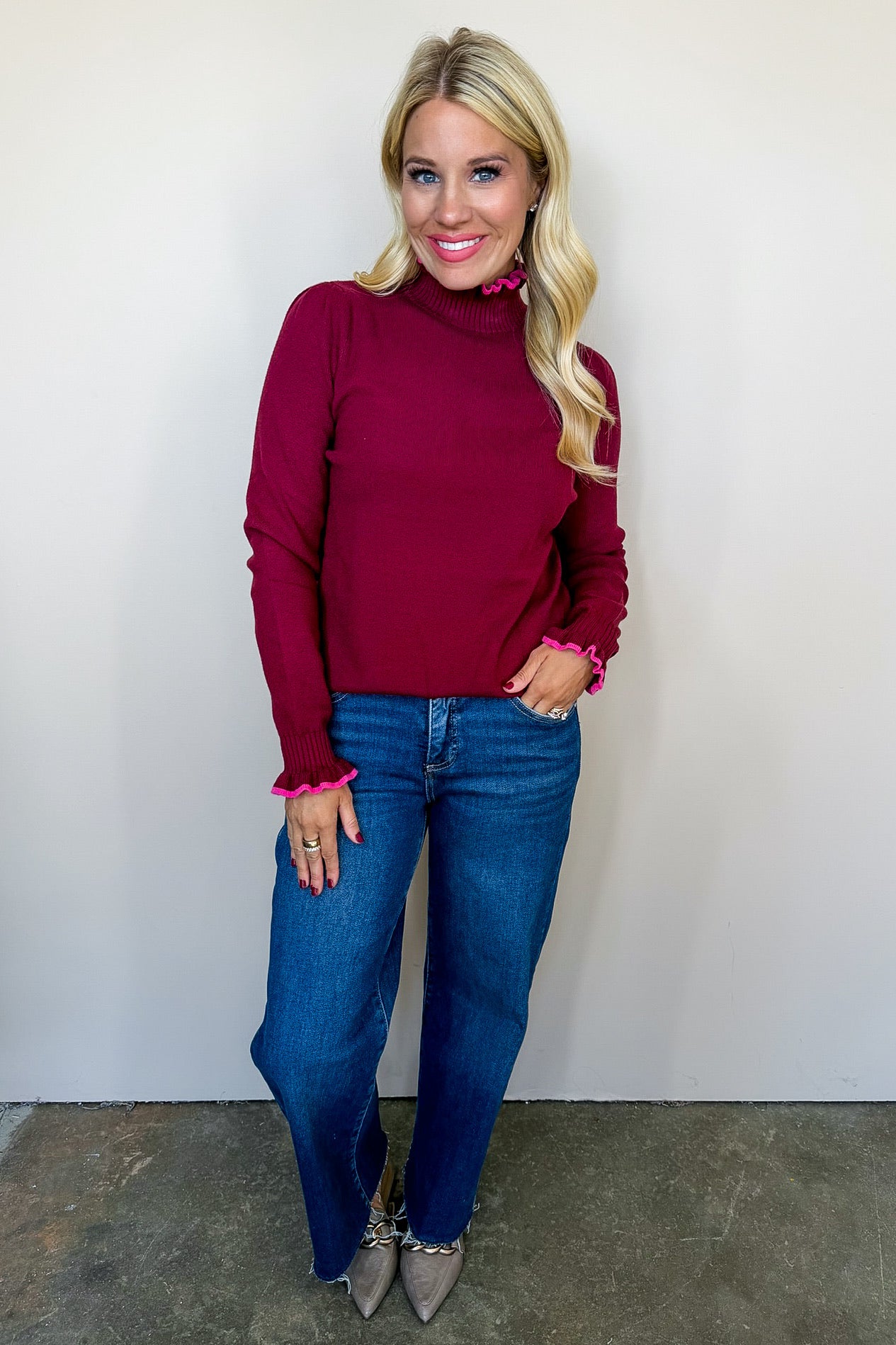 This burgundy top features a high mock neck with a cozy ribbed texture and playful pink ruffled trim that adds a fun pop around the neckline. Long sleeves end in softly gathered cuffs, while the ribbed hem hugs your waist for a sleek, slim fit silhouette.