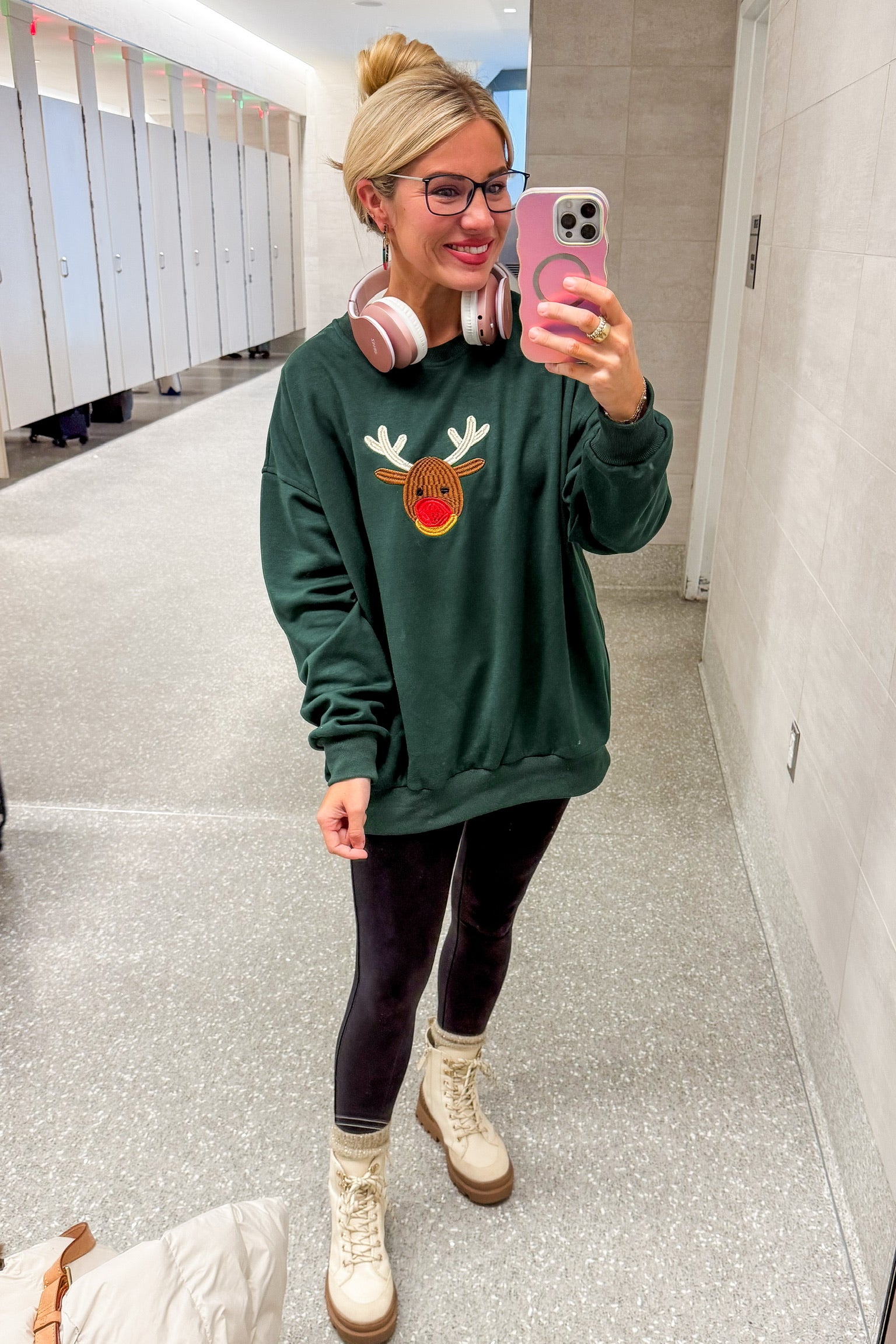 Get ready to sleigh the season in this adorable reindeer crewneck! This soft, cozy sweatshirt features a cute reindeer motif front and center that instantly brings the holiday spirit. Whether you're trimming the tree, running festive errands, or heading to a holiday party, this sweatshirt keeps you warm, comfy, and totally in the Christmas mood.