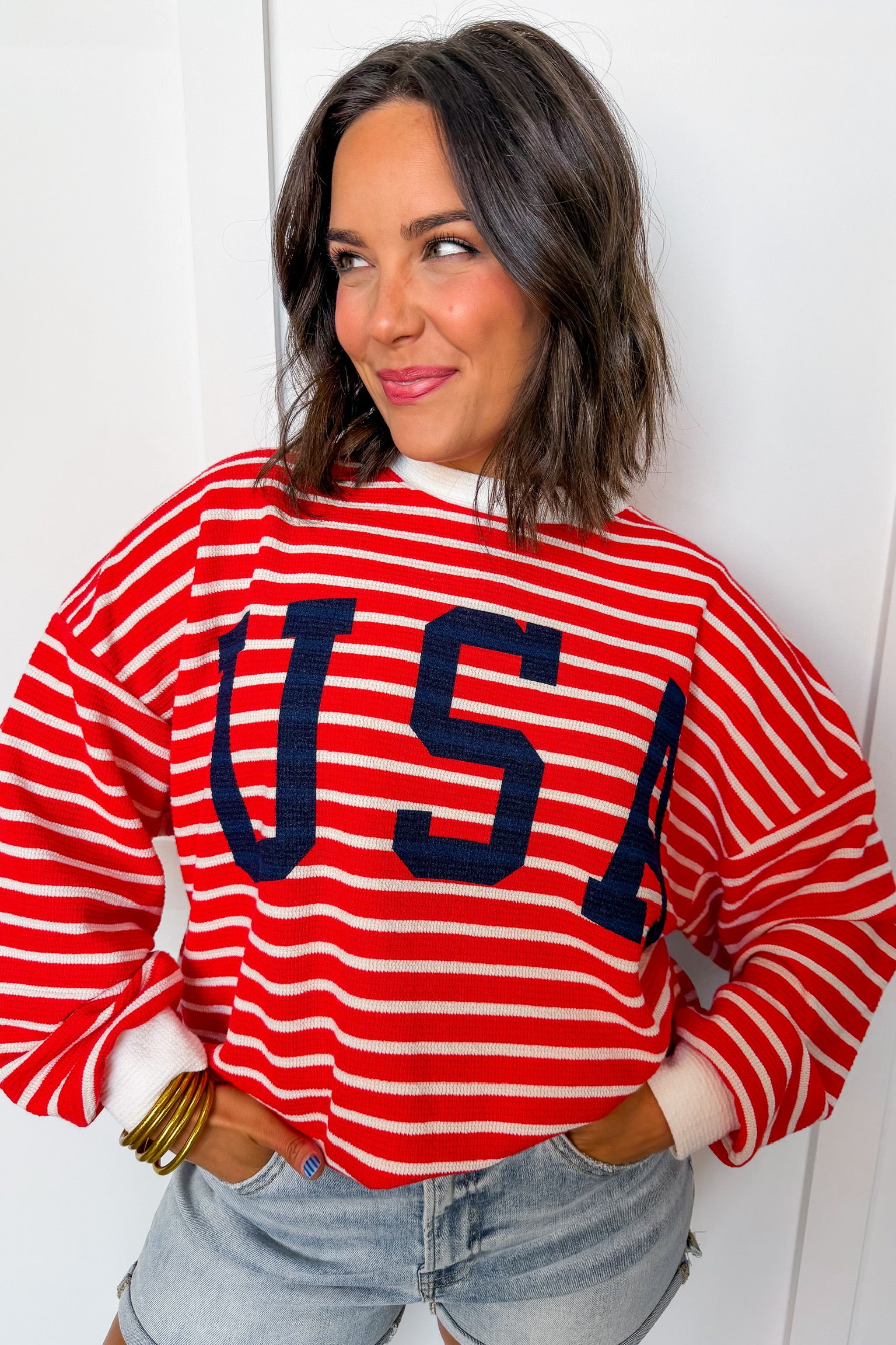 Classic, bold, and made for celebrating — The All-American Stripe USA Sweater is your go-to for all things red, white, and cute. Featuring timeless red and white stripes with a standout “USA” graphic, this sweater brings the perfect mix of cozy and patriotic.