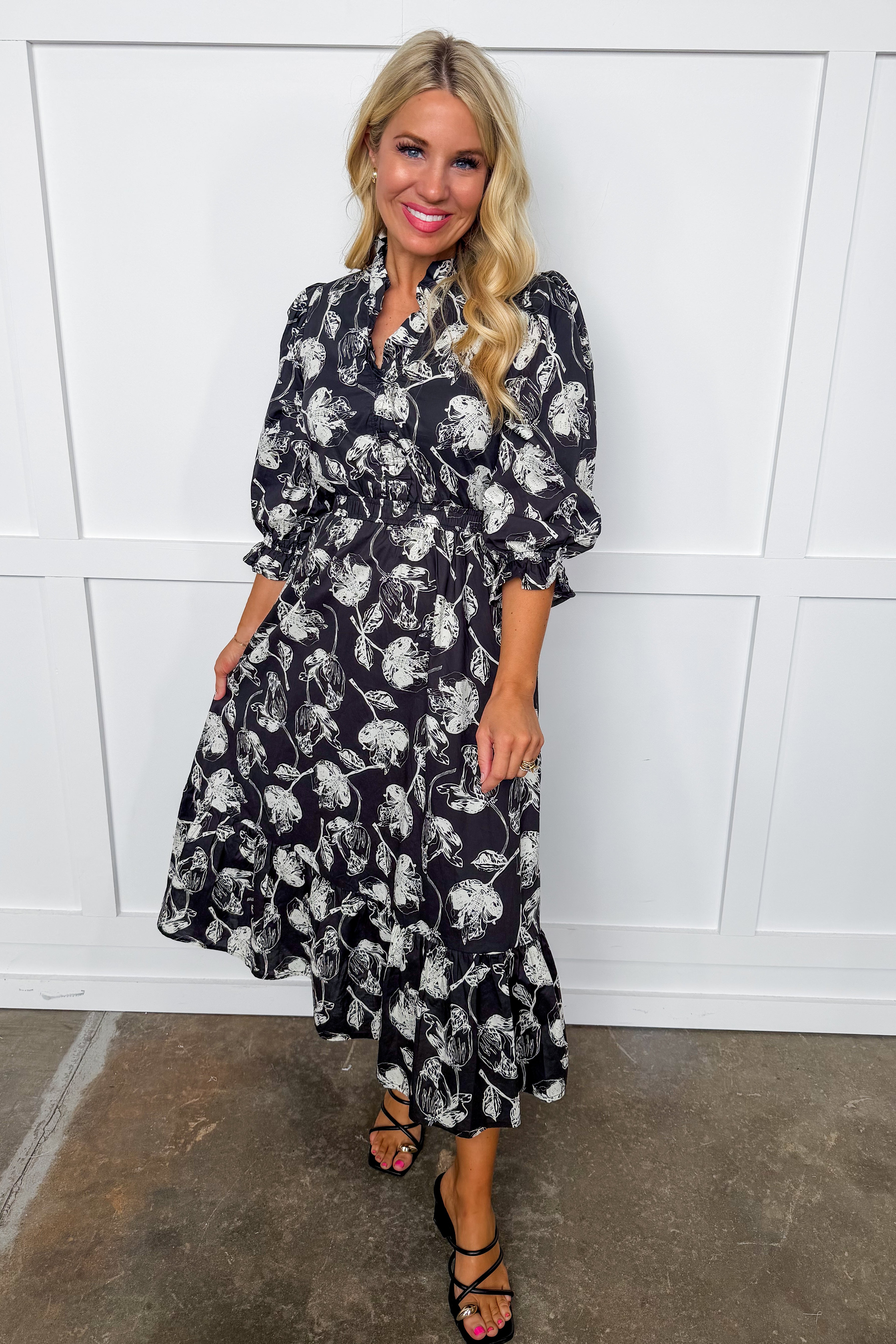 This playful midi dress features a V-neck, long sleeves with snug cuffs, and a cinched waist for a flattering fit. Adorned with a floral pattern and charming ruffle details at the neckline, it flows beautifully for a fun, flirty look.