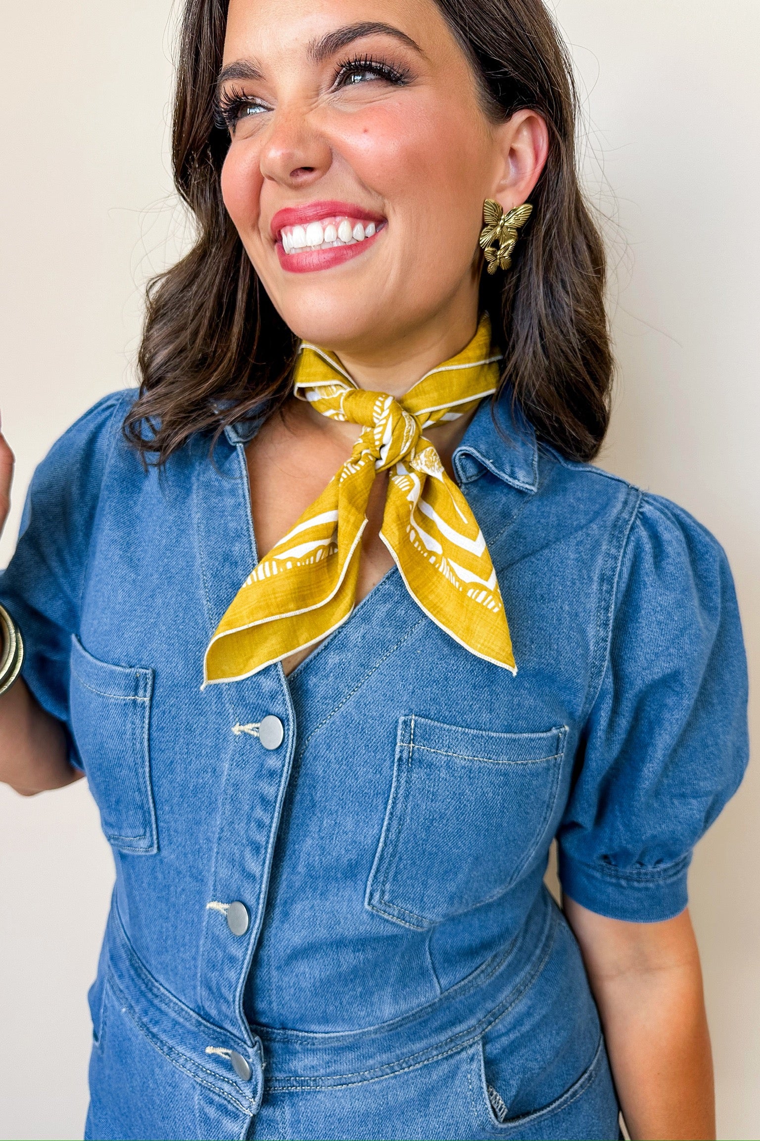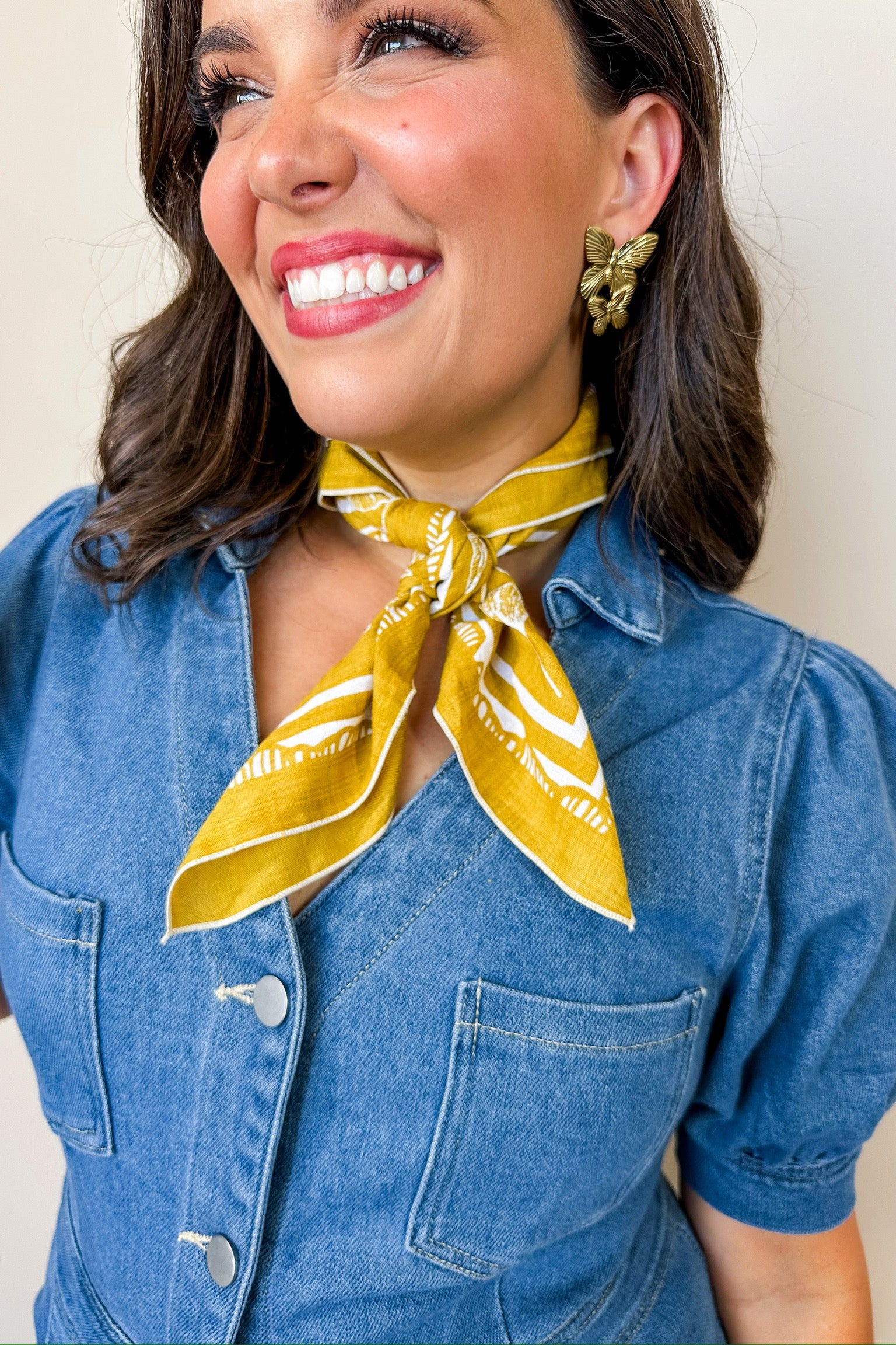 Add a splash of sunshine to your outfit with this playful mustard floral scarf bandana. Its charming floral pattern and trendy mustard hue make it the perfect accessory to brighten any look. Wear it around your neck for a cute, effortless style that’s both fun and fashionable.