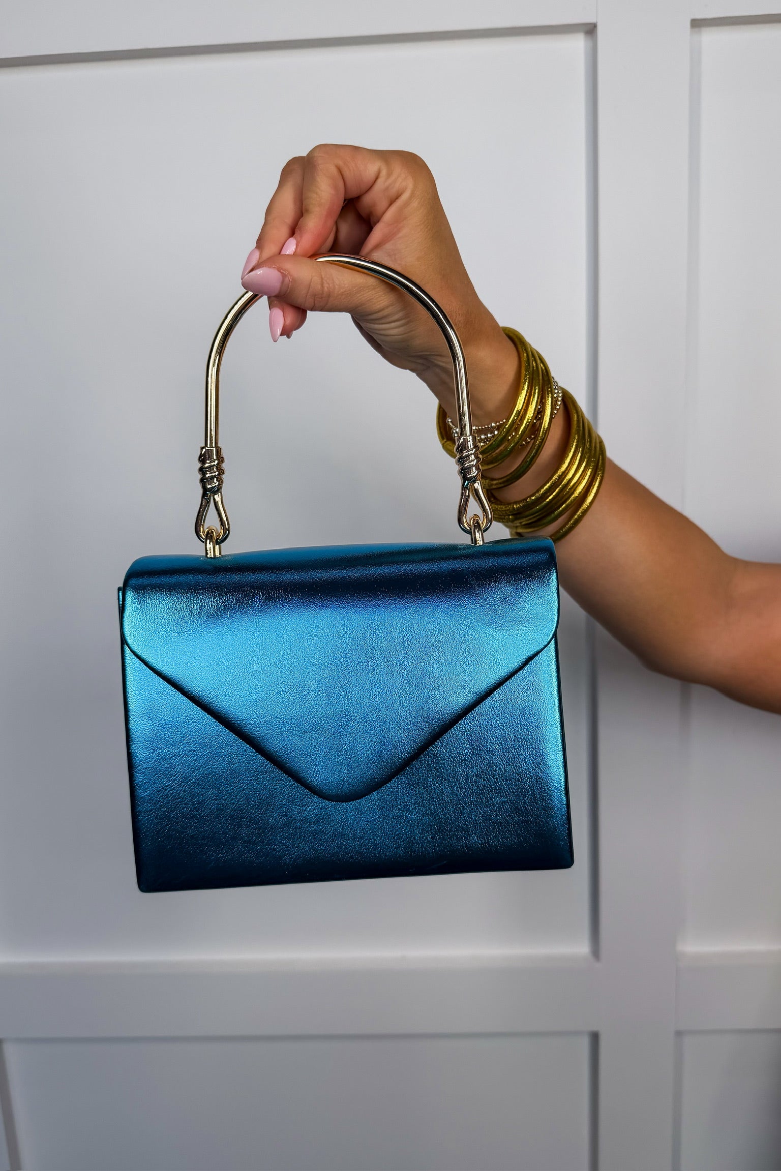 Meet your new go-to glam bag — bold, shiny, and guaranteed to turn heads. This metallic structured purse is the perfect statement accessory for nights out, date nights, concerts, girls trips, or anytime you want a pop of personality in your outfit. With a luxe gold top handle + optional chain strap, it easily transitions from classy hand-carry to crossbody convenience. Small but mighty — it fits all the essentials (phone, cards, lip gloss) without the bulk.