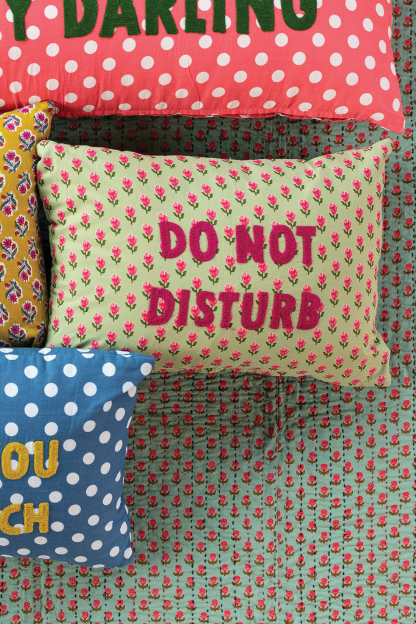Add a playful personality to your space with the Do Not Disturb Floral Lumbar Pillow. Featuring a charming all-over floral pattern on soft cotton voile fabric, this decorative pillow is accented with bold embroidered lettering that reads “Do Not Disturb” for a fun and expressive touch. The vibrant pink flowers against a fresh green background create a lively, garden-inspired look that instantly brightens sofas, beds, or reading nooks. With its comfortable lumbar shape and whimsical message, this pillow brings both style and character to any room.