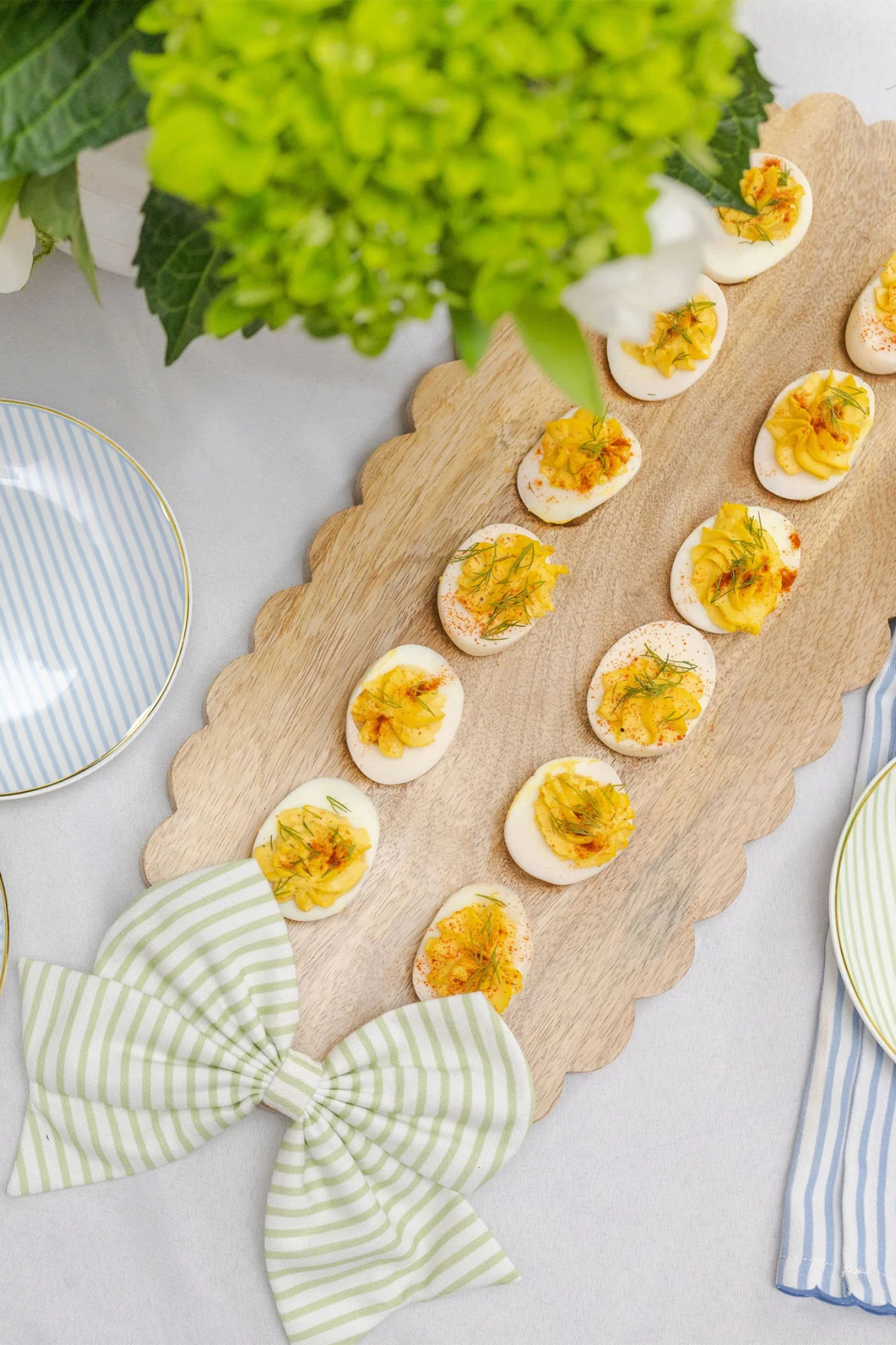 Introducing our Reversible Scalloped Bow Board - a versatile and stylish addition to your kitchen! This beautifully crafted board features an inlaid magnet that allows you to easily attach and remove our charming new bows on both sides, for a personalized touch. One side features carved divots perfect for holding deviled eggs, while the reversible flat side offers a sleek surface for serving or prepping.