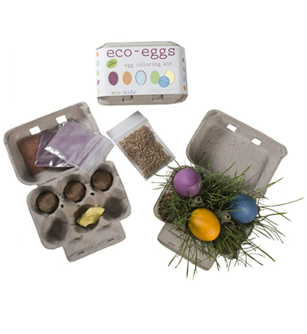 Includes:3 powder-based coloring packets made with all-natural and organic vegetable & plant extracts with dried vinegar, eco-crayon for decorating eggs prior to dipping, grass seed, 2 eco-coconut husk pucks (just add water to make soil). Plus color chart and instructions. Non-toxic.