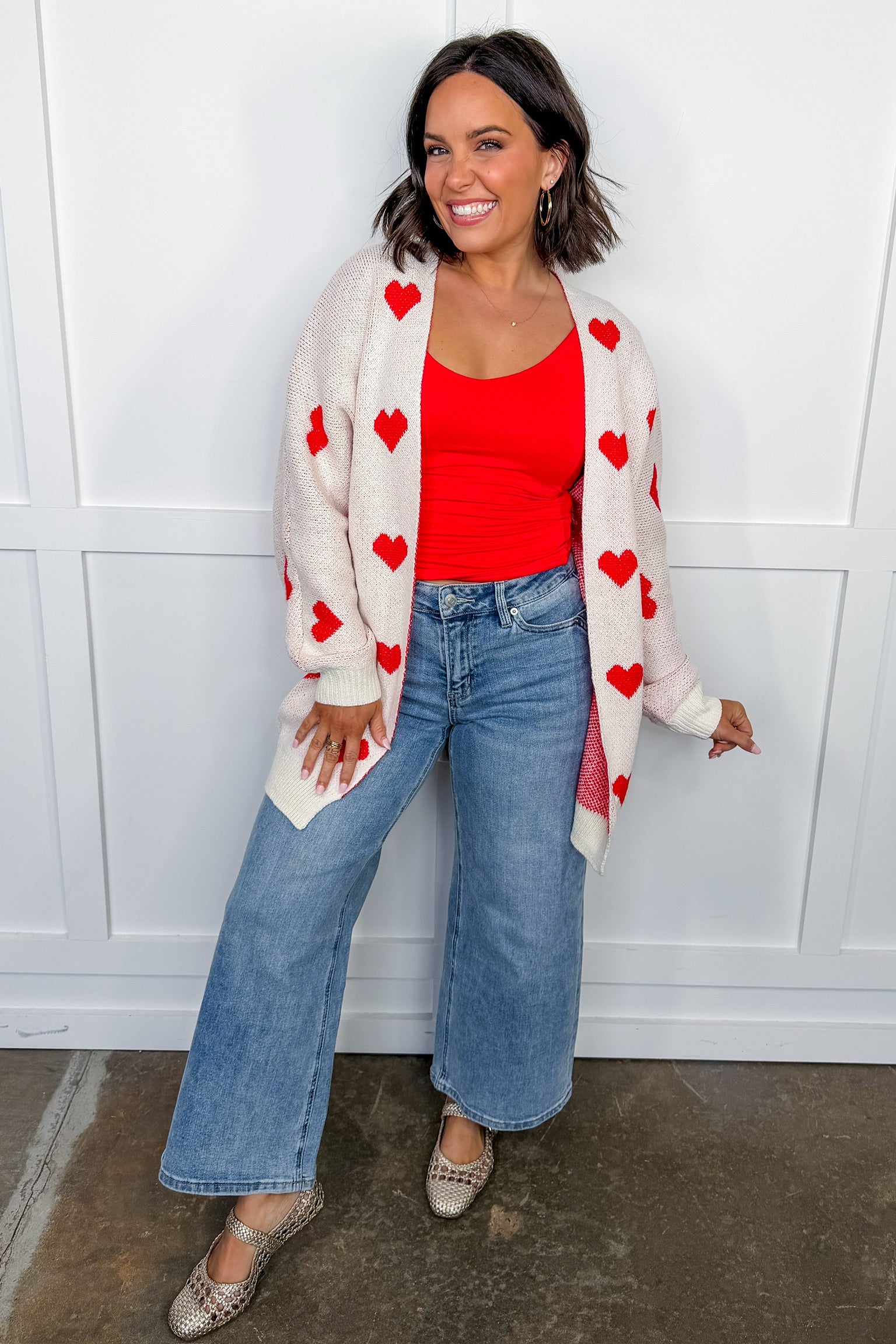 Fall head over heels for this charming Heart Print Cardigan! Designed with an ultra-soft knit and scattered red hearts, this piece adds the perfect dose of cozy romance to any outfit. Whether you're layering it over a tee, tank, or dress, this cardigan brings effortless sweetness and warmth all season long.