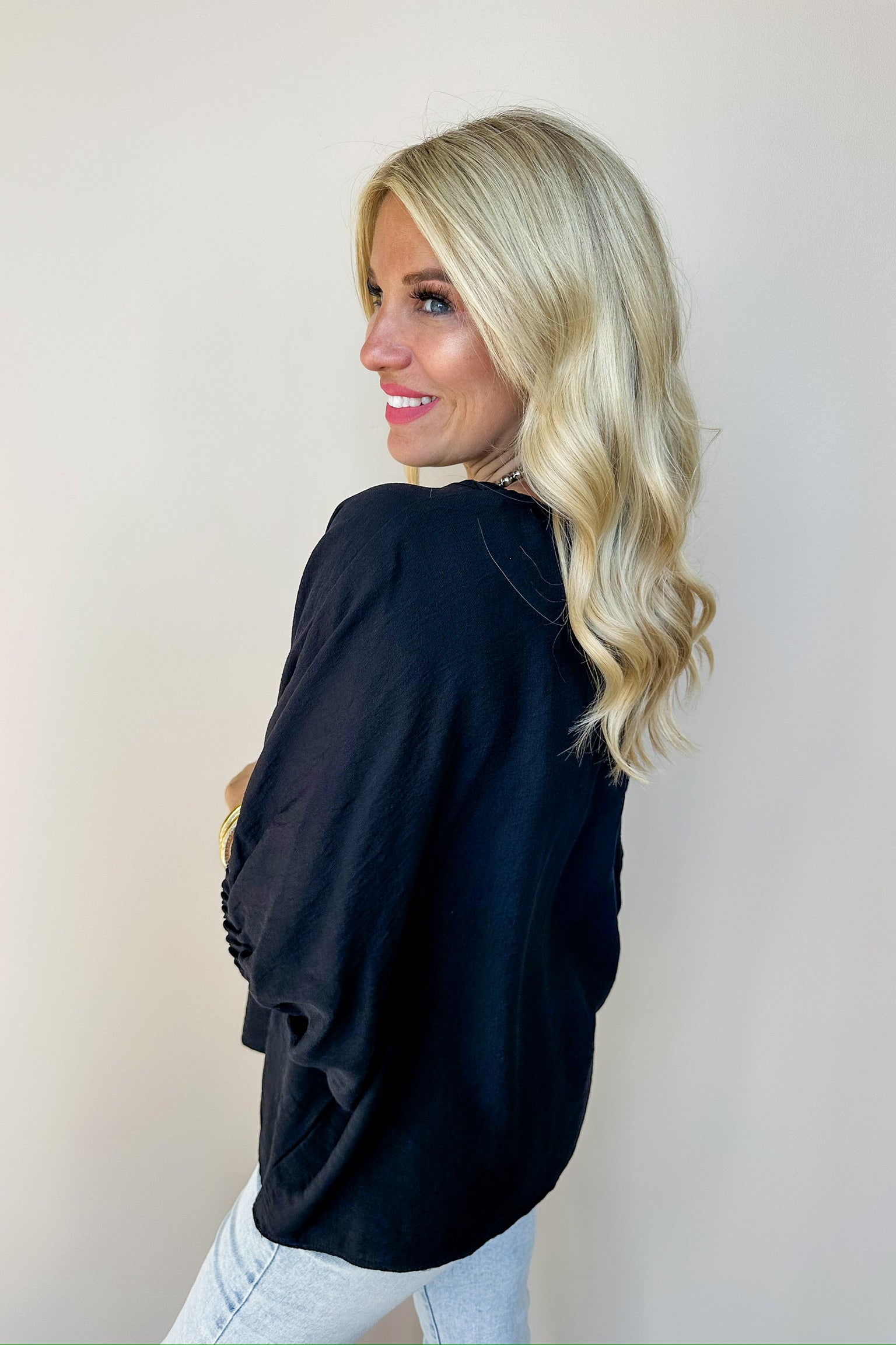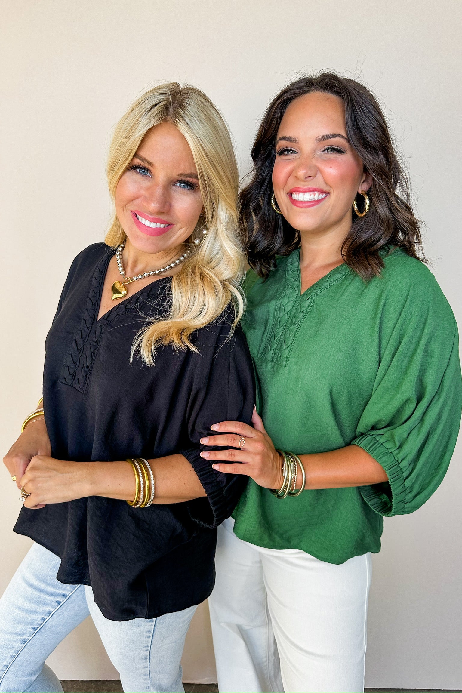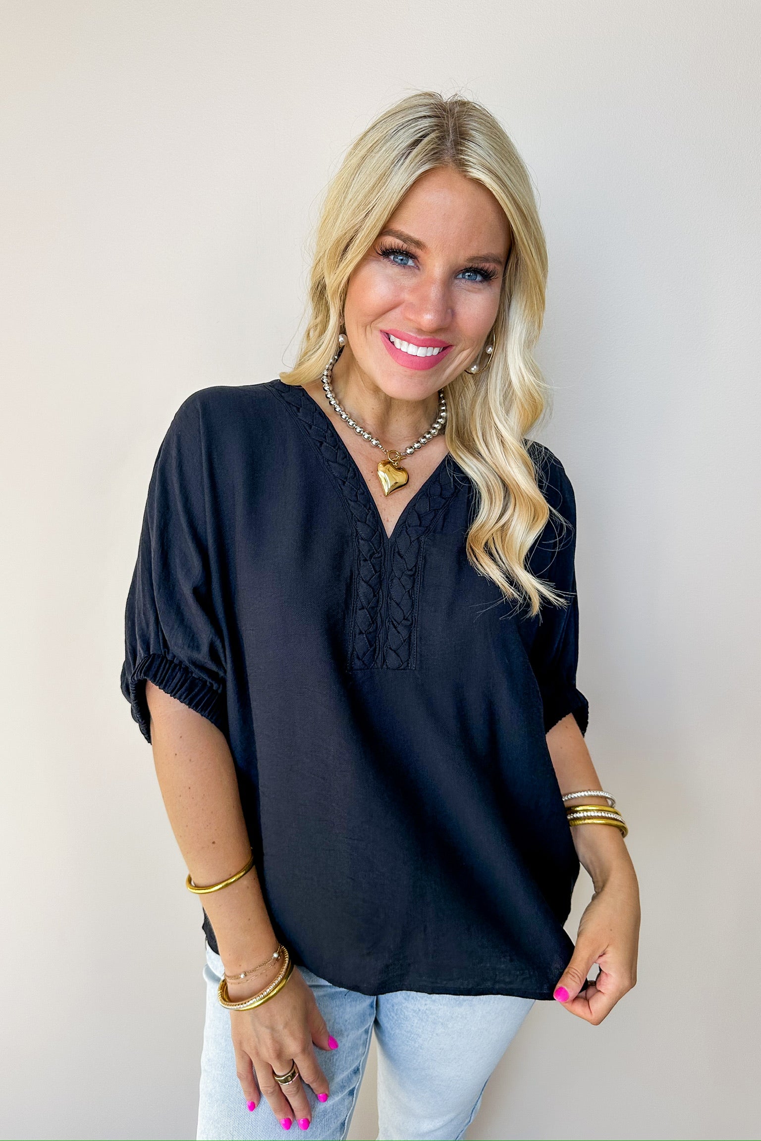 This playful black blouse features a chic braided top and billowing sleeves that add a touch of drama to your look. The flattering V-neck detail keeps it effortlessly stylish, making it a perfect basic with a twist for any occasion.