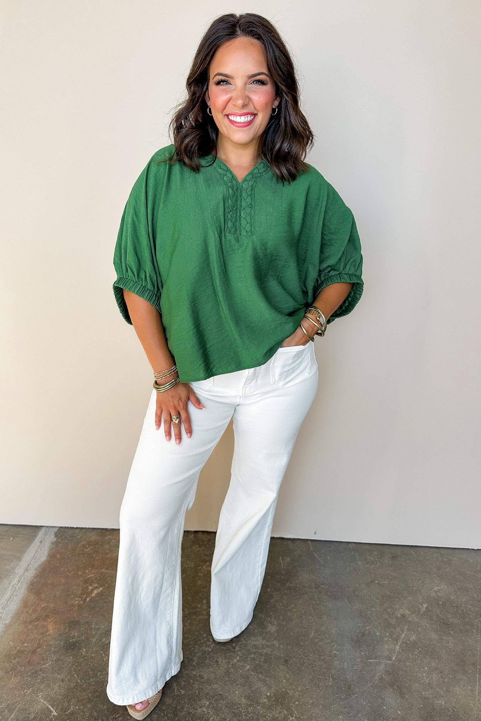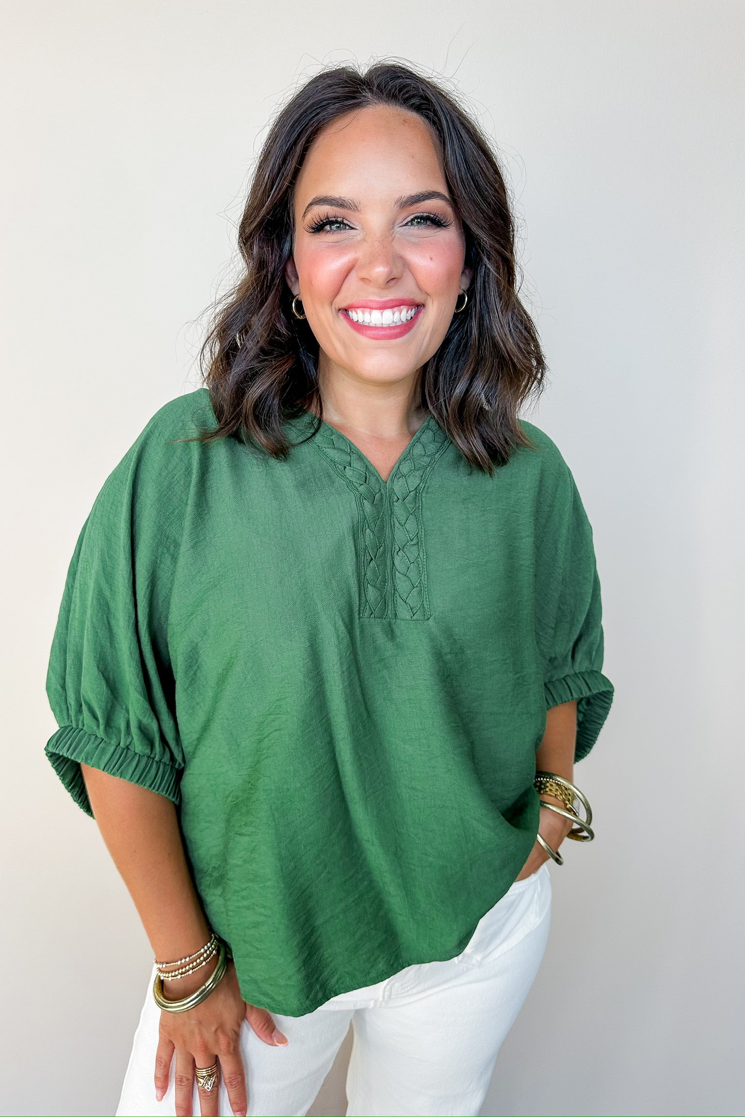 This playful green blouse features a chic braided top and billowing sleeves that add a touch of drama to your look. The flattering V-neck detail keeps it effortlessly stylish, making it a perfect basic with a twist for any occasion.