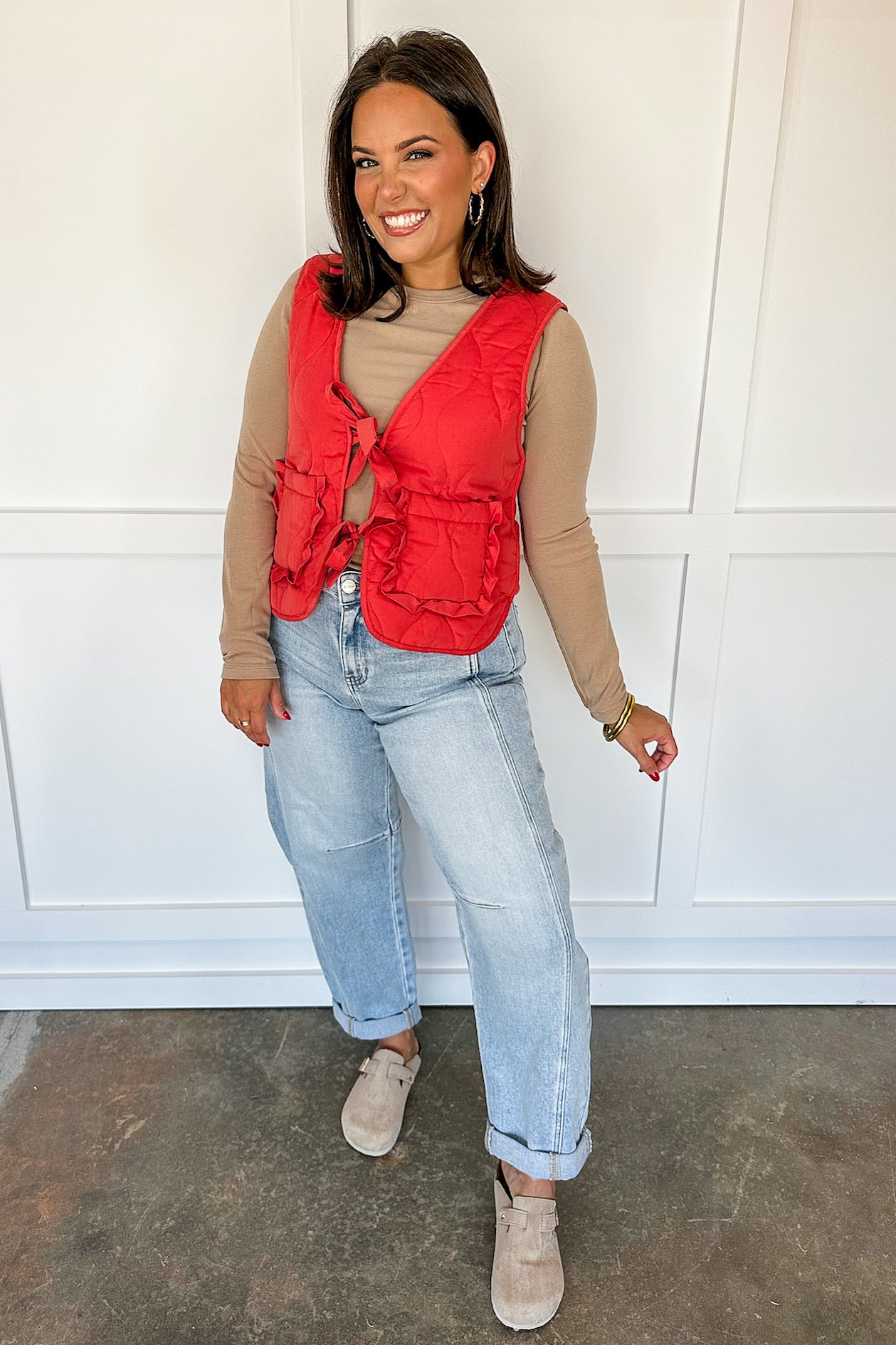Stay cozy and stylish with the Autumn Escape Red Puffy Vest! Featuring a playful front tie closure and a flattering V-neck, this sleeveless vest is perfect for layering over your favorite tops. Keep your hands warm or stash essentials in the handy pockets. Available in multiple colors, it’s an easy way to add a pop of fun to your fall wardrobe.