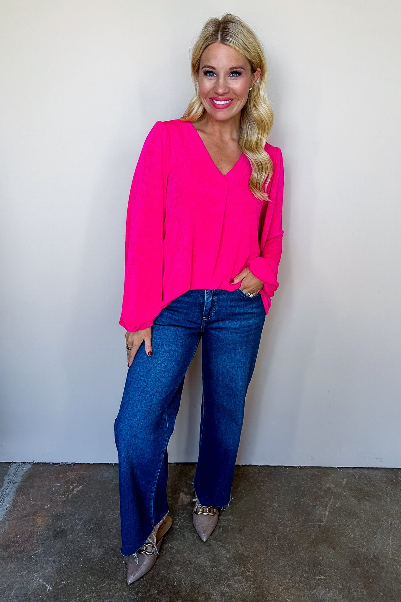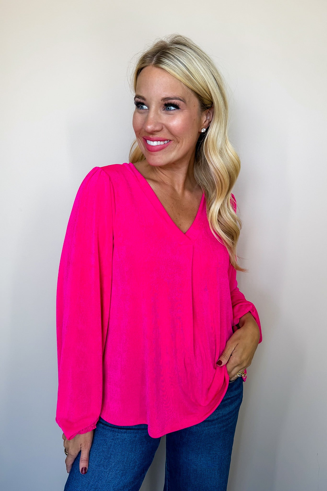 Step into boss mode with this playful V-neck top, featuring long sleeves with elastic cuffs for a comfy fit. Lightweight and bright pink, it offers inclusive sizing and comes in fun colors like camel and green to match your mood