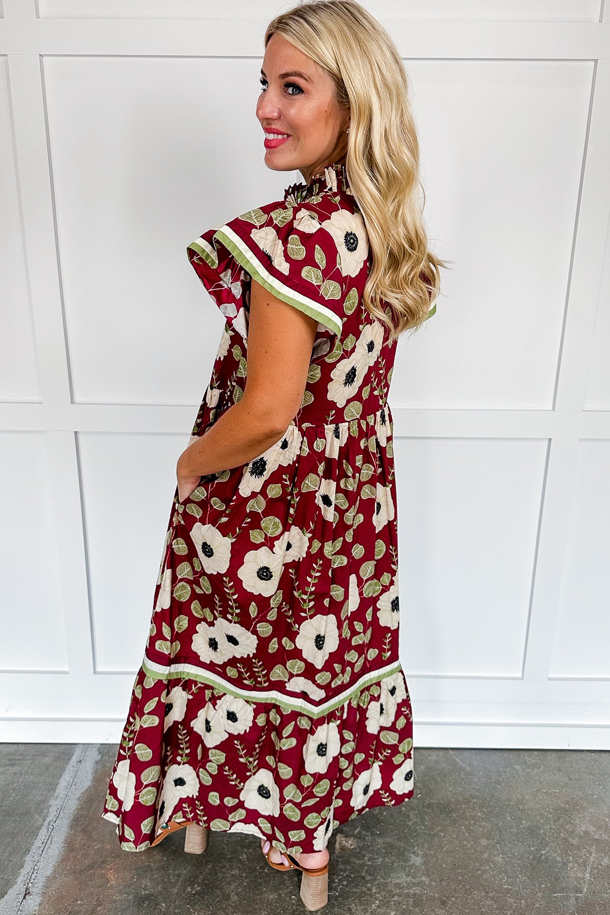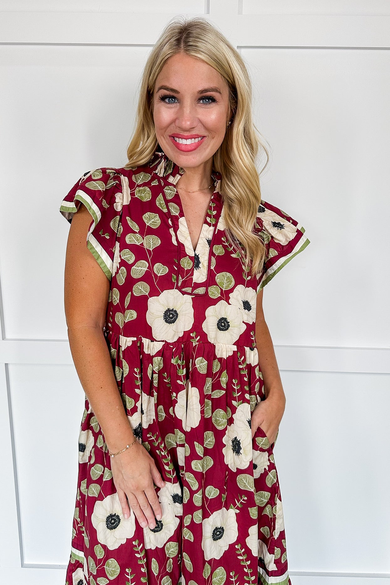 Step into effortless charm with the Capture The Moment Floral Midi Dress in Wine. This playful midi features a rich burgundy base accented with delicate green and ivory floral details. Flirty ruffle short sleeves add a fun touch, while practical pockets let you keep your essentials close. Perfect for twirling through any day or night, this dress blends comfort and style with a fresh, feminine vibe.