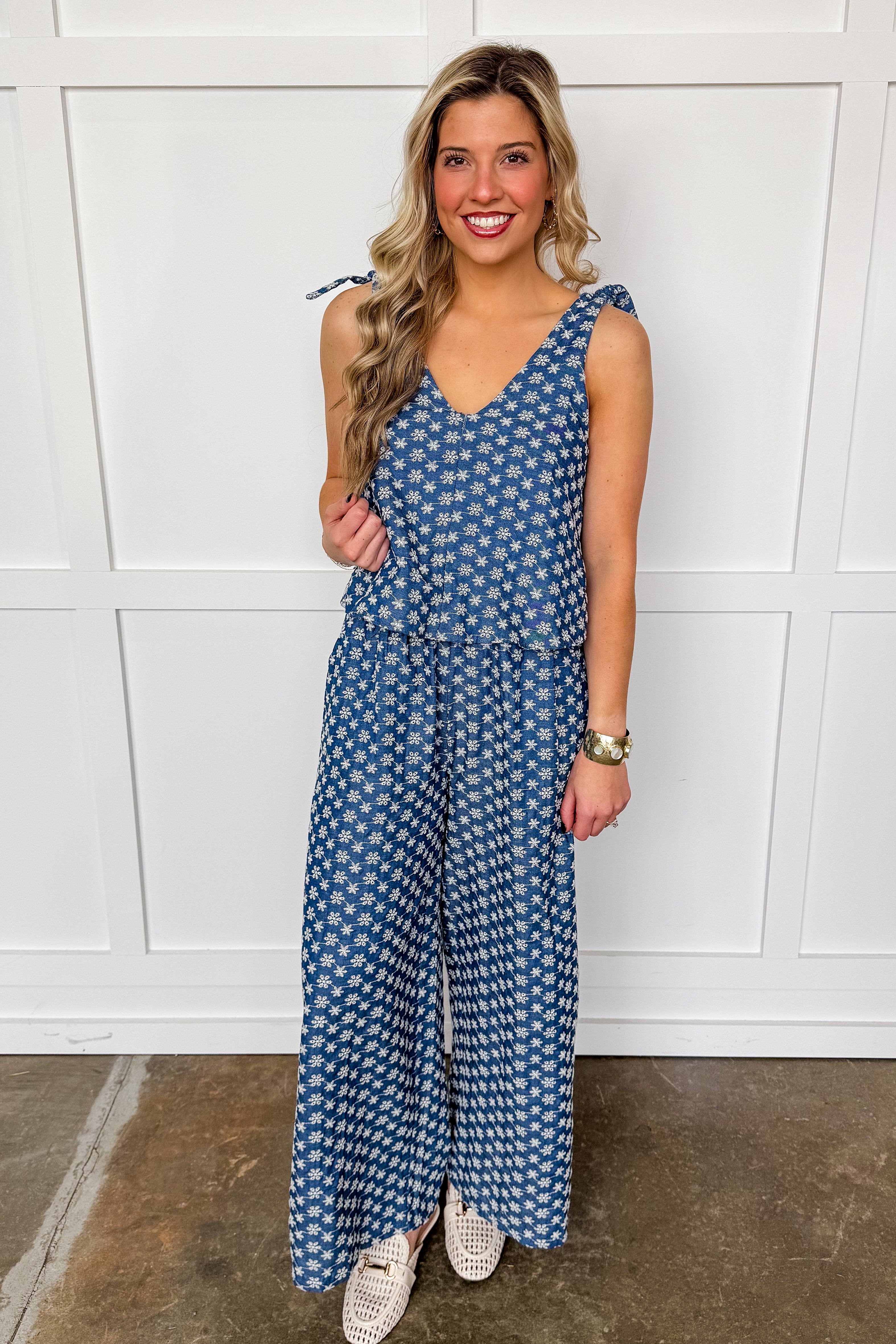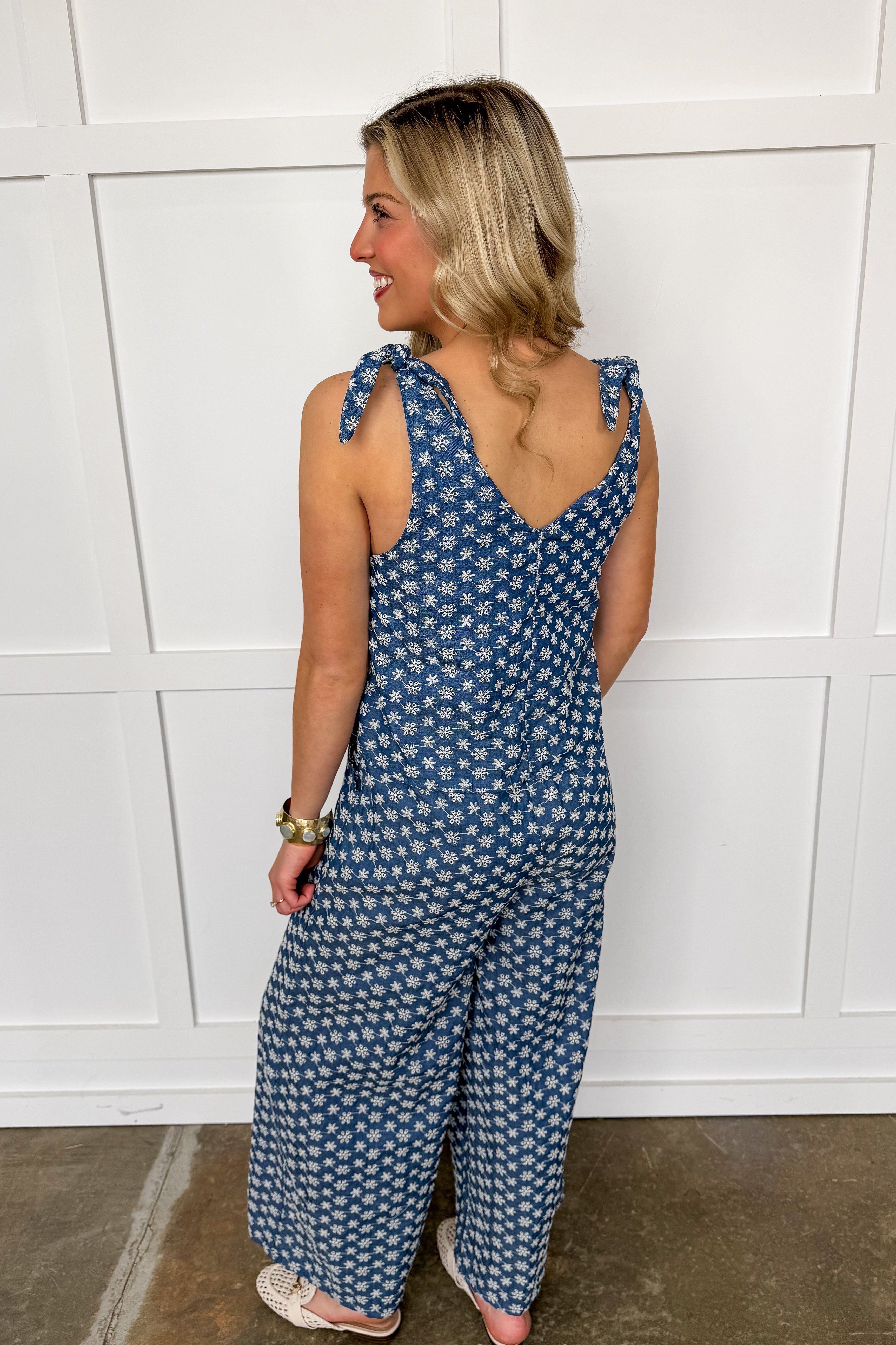 This playful embroidered floral chambray jumpsuit features adjustable tie straps for a perfect fit and a convenient zipper closure in the back. The charming white embroidered stitching adds a fun, stylish touch to your casual wardrobe. Perfect for effortless, all-day comfort with a dash of personality.