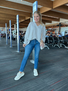 These jeans are guaranteed to be some of your new favorites! Dress them up or wear them casually. They have the perfect amount of stretch, and they are mid-rise. They fit straight through the legs, and they’re not completely skinny through the ankle. They’re perfect for millennial gals that still love a skinny jean, but want to be a little more on trend. Our model is wearing the size 3.
