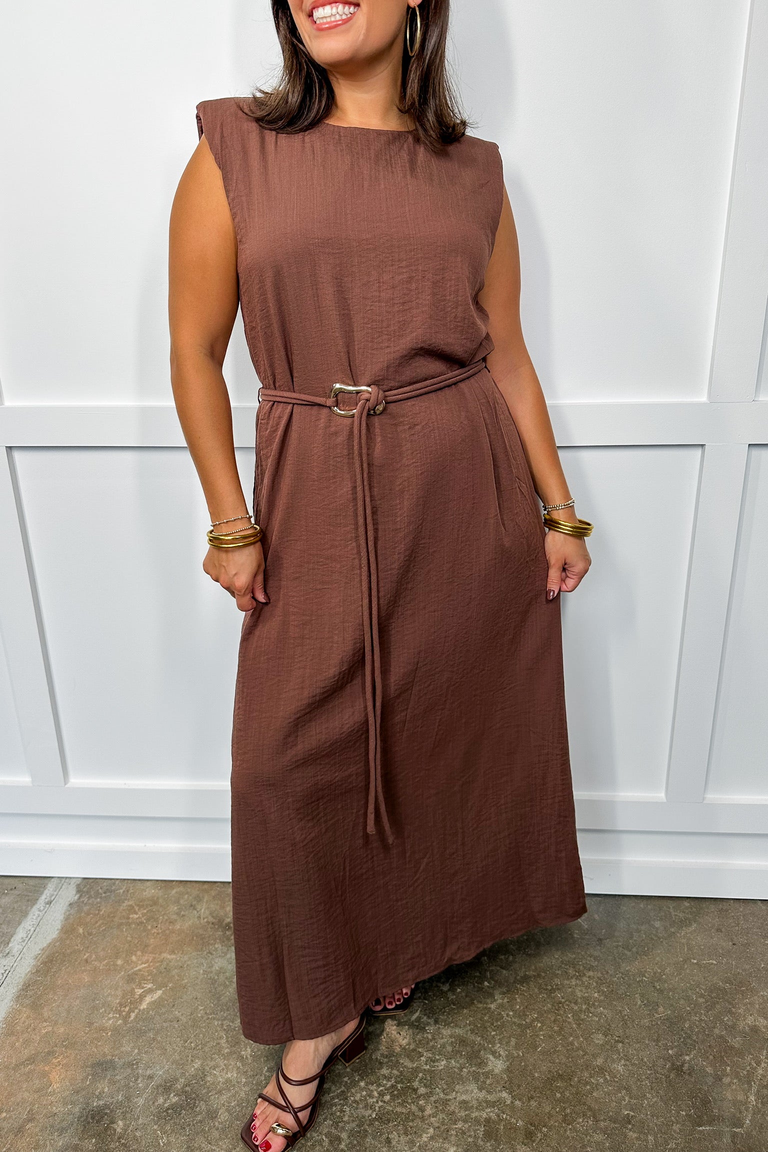 This Radiance Ready Belted Midi Dress in Espresso is your new go-to for effortless style. The fitted silhouette hugs your curves, while the high neck adds a touch of elegance. Sleeveless and belted at the waist, it flatters your figure and lets you show off your playful side. Available in a variety of colors and patterns, there’s a perfect version waiting just for you!