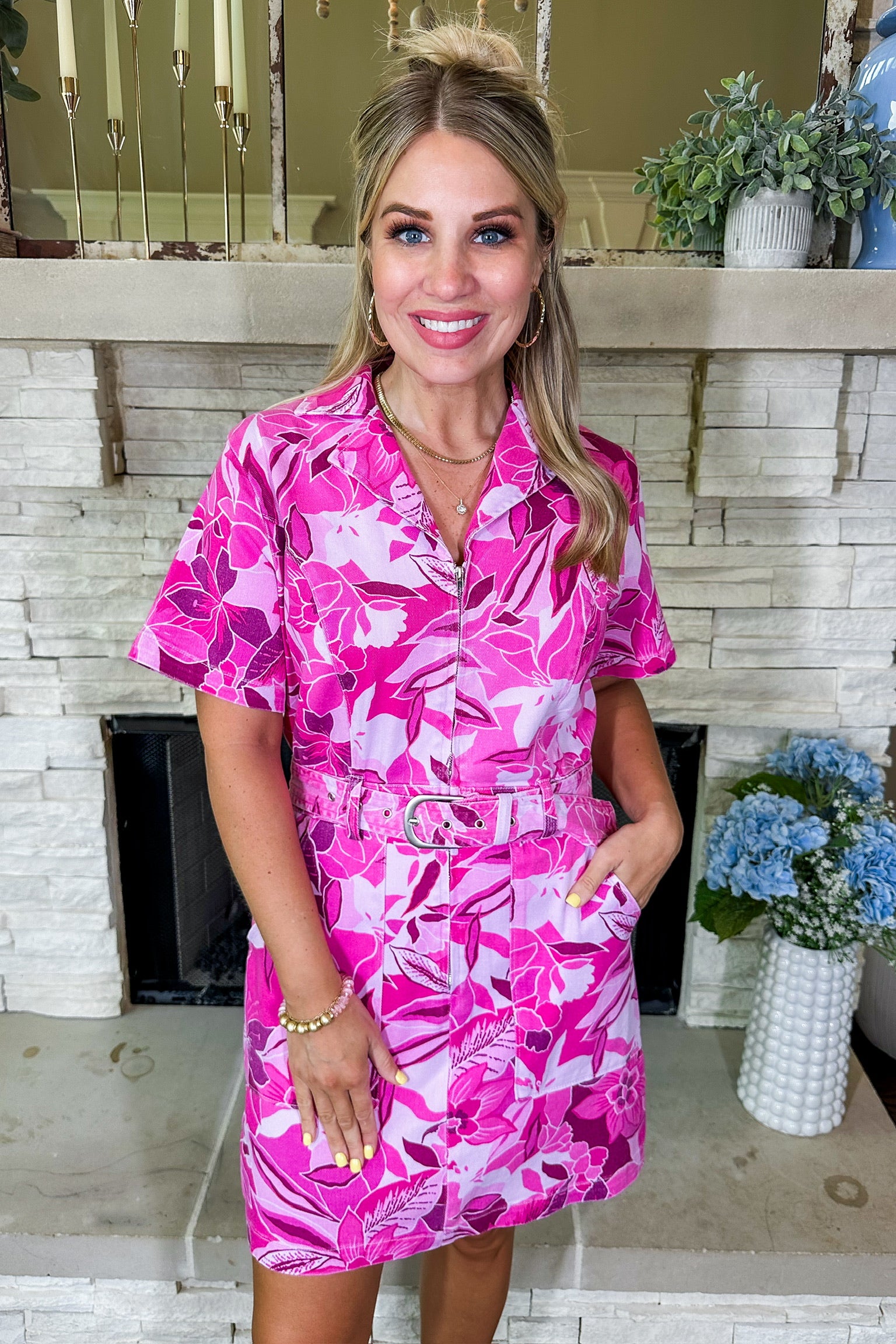 Pretty meets practical in this flirty magenta mini! Bursting with bold pink hues, this above-the-knee dress features a cute collared neckline, handy pockets (yes, real ones!), and a fun front zipper for easy on-and-off. The matching belt pulls it all together with a sweet cinch at the waist—perfect for twirling, brunching, or just feeling fabulous all day long.