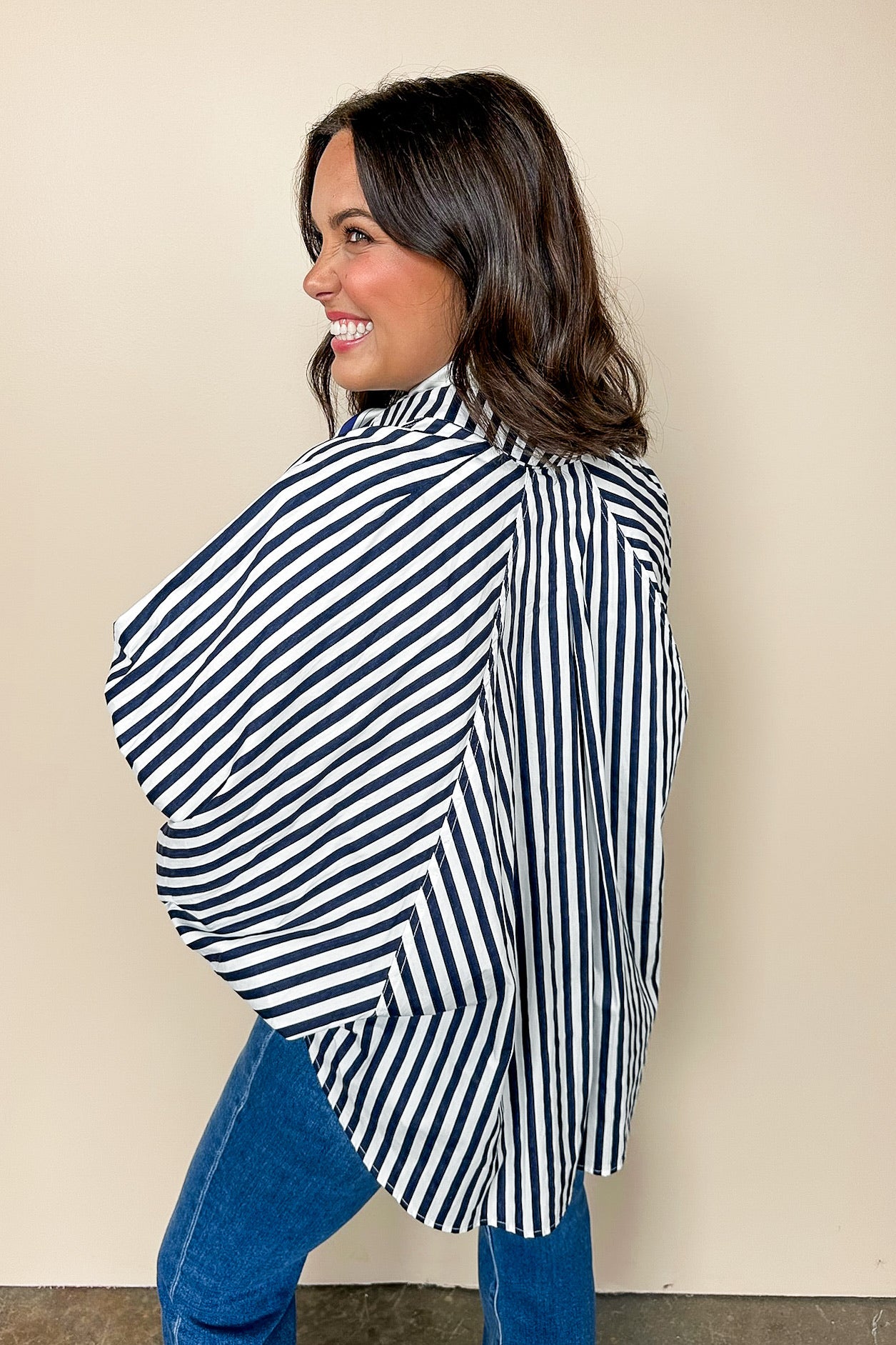 Striped & True Collared Button Down Poncho Top in Navy