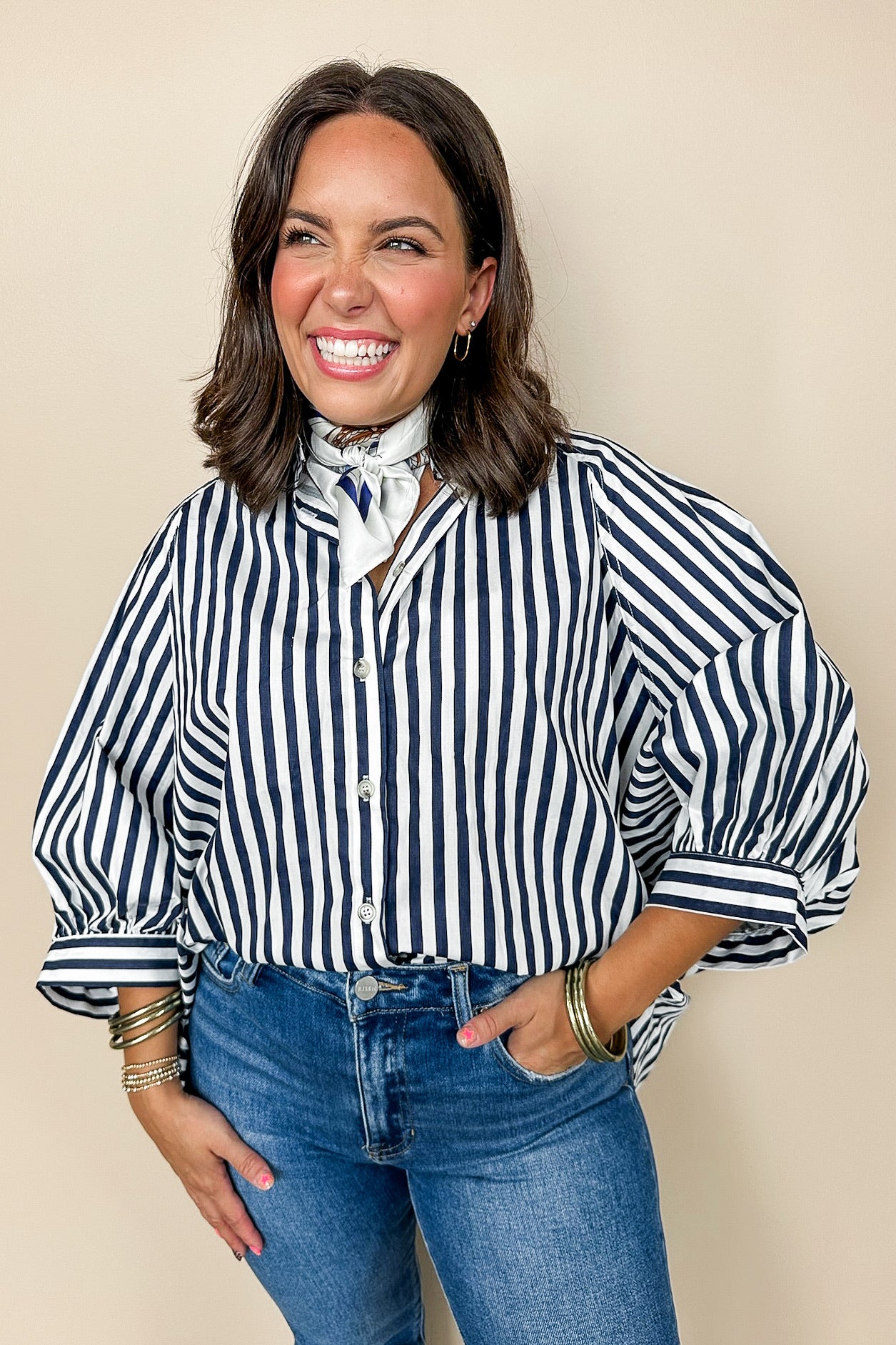 Elevate your style with our Striped & True Collared Button Down Poncho Top. Featuring a scooped high low hem, button cuff sleeves, and a versatile design that pairs perfectly with white denim or tailored dress pants. Show off your true fashion sense with this playful and polished top!
