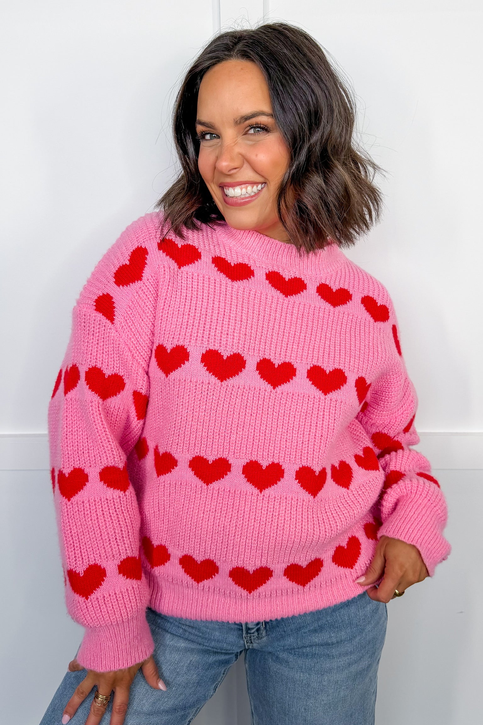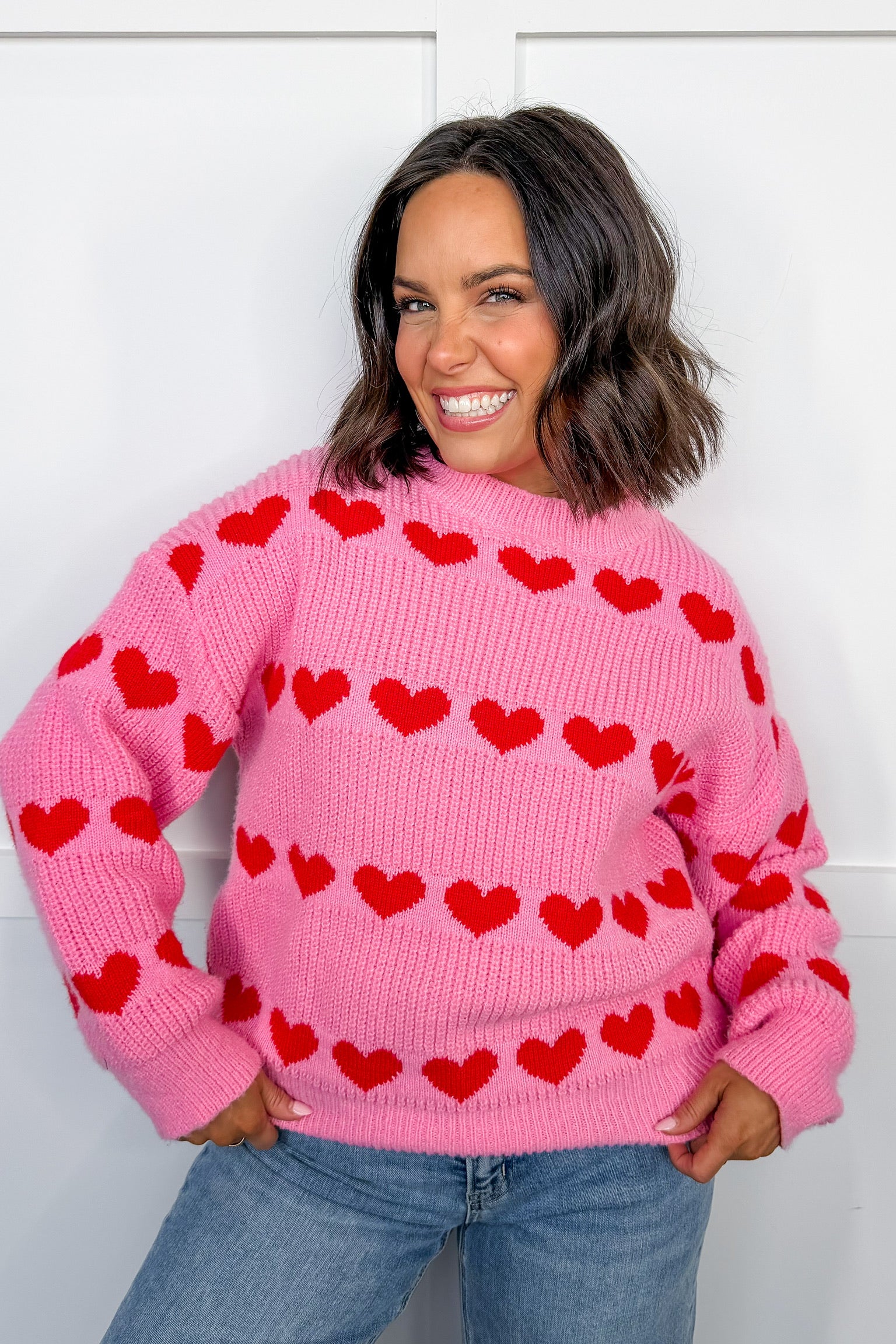 Wrap yourself in adorable charm with our Sweetheart Stroll Sweater! This cozy pink knit is sprinkled with rows of bold red hearts, creating the perfect playful-yet-chic look. Designed with a relaxed fit and soft yarn, it’s the ideal pick for Valentine’s season, girls’ nights, coffee dates, or anytime you feel like showing a little love. Pair it with leggings, denim, or a cute mini skirt for the sweetest outfit ever!