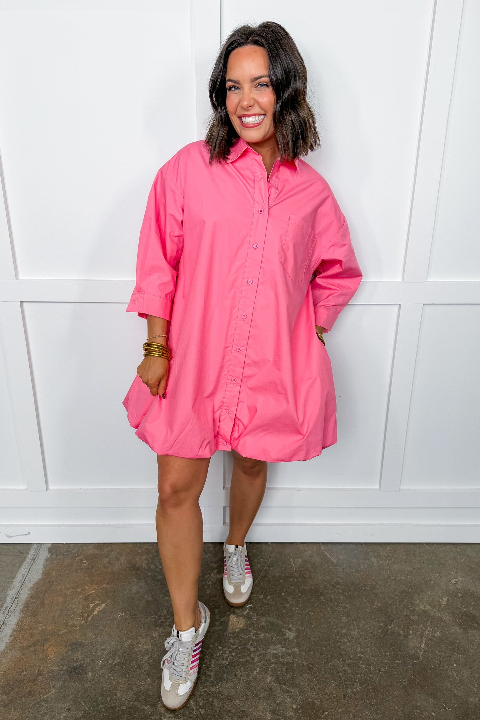 Easy, breezy, and effortlessly chic — The Perfectly Pink Bubble Babe Dress is your go-to for relaxed days that still call for a put-together look. Designed with a classic collared neckline and full button-down front, this oversized silhouette drapes beautifully for a flattering, comfortable fit. The lightweight fabric makes it perfect for warm days, whether you’re running errands, heading to brunch, or styling it up with sandals and statement accessories.