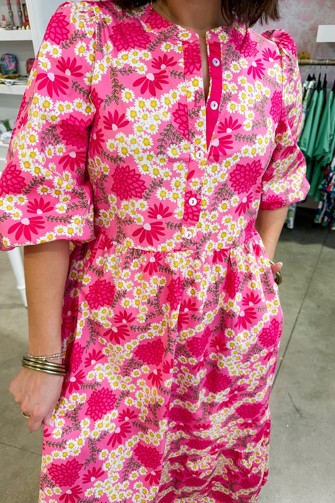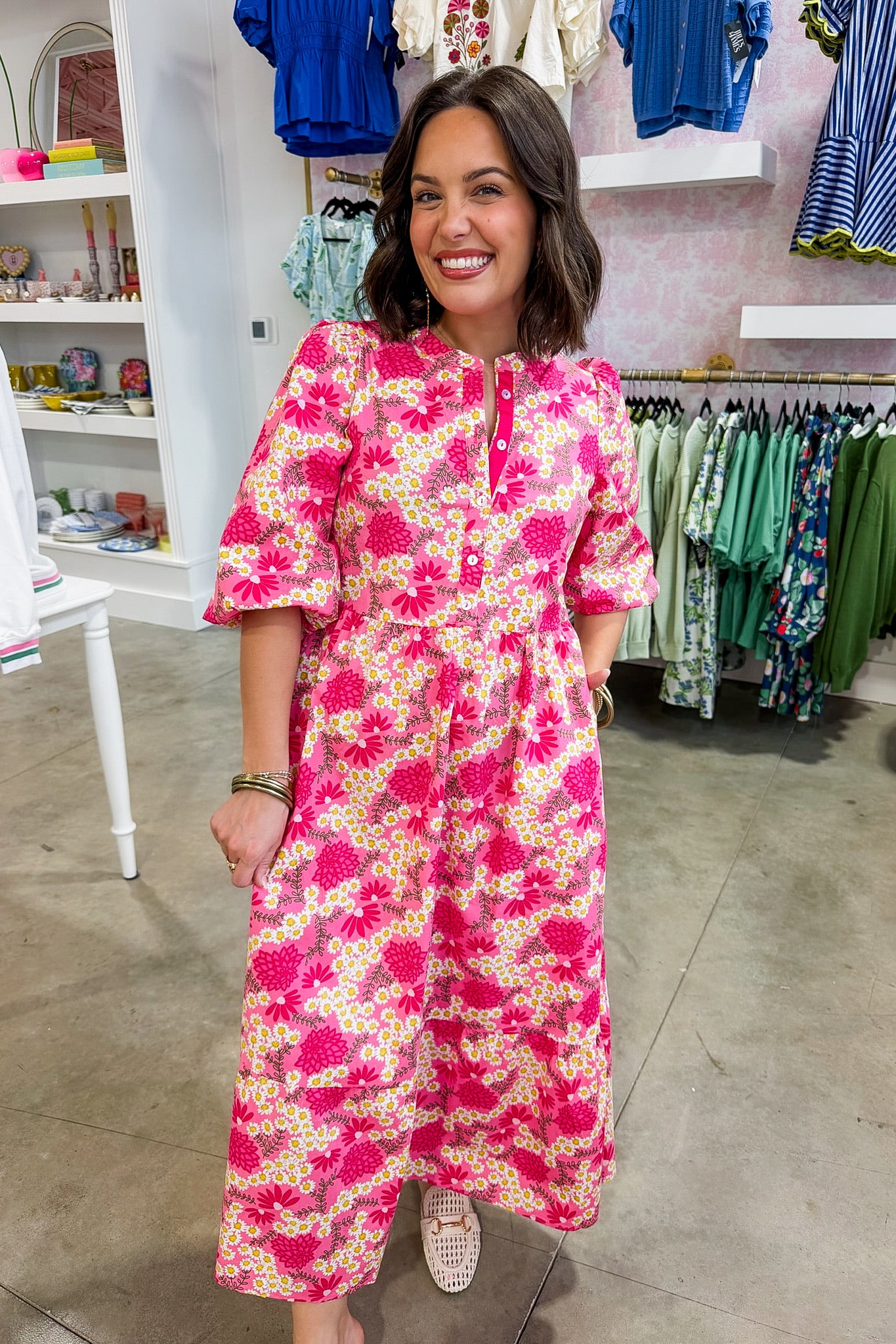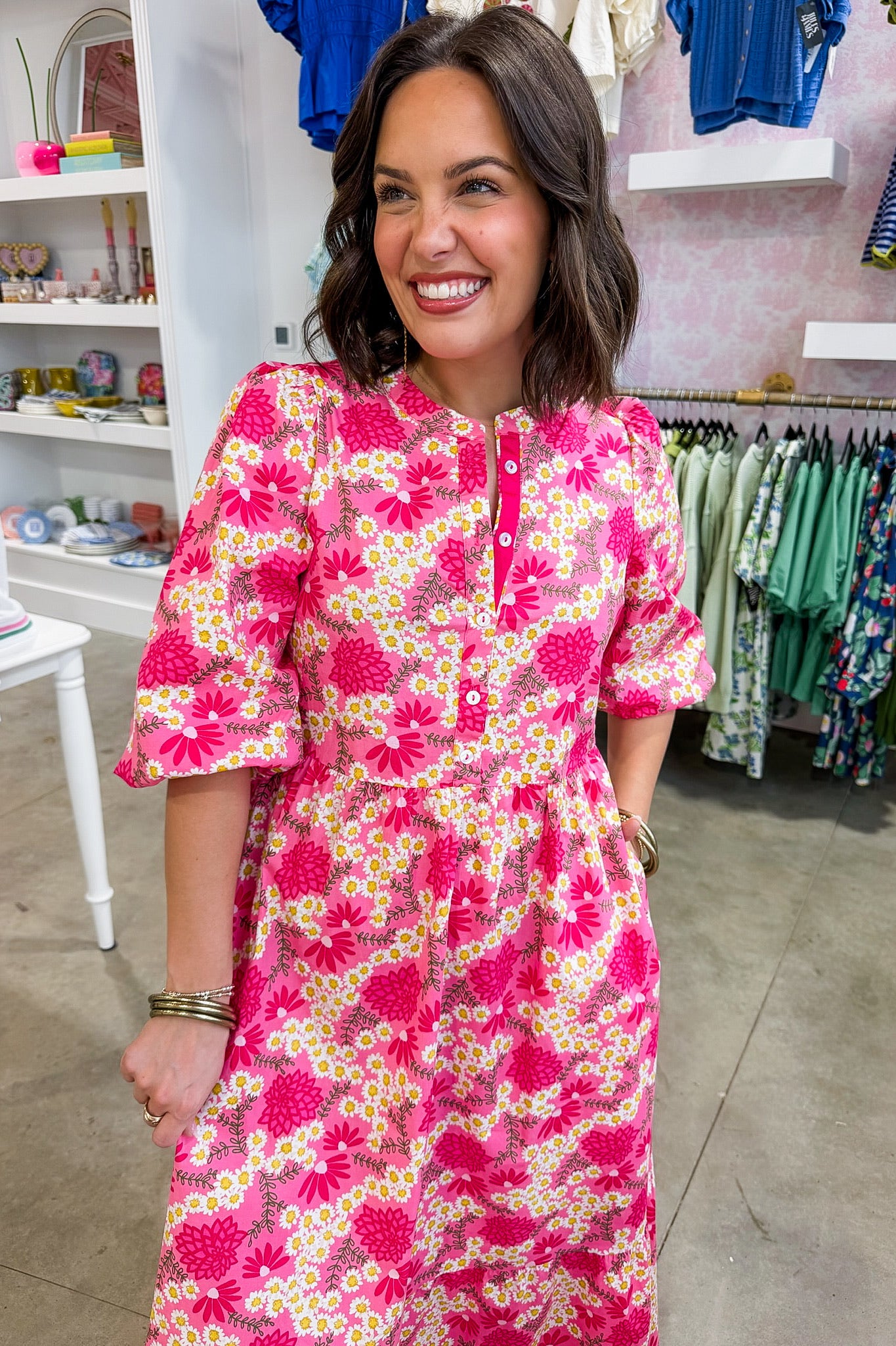 Softly romantic with an easy, everyday feel, The Riley Dress in Pink Floral features a beautiful floral print in vibrant pink tones that feels both cheerful and timeless. Designed with a flattering midi length and relaxed silhouette, this dress offers graceful movement and all-day comfort. Thoughtful details like side pockets and soft sleeves make it an effortless choice for brunch, showers, or casual gatherings.