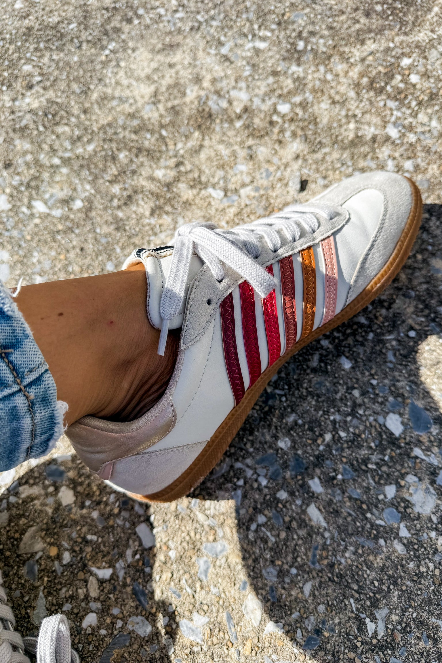 Enjoy a flawless fit with these true-to-size sneakers, featuring sleek Metallic red stripe family that add a bold touch to any outfit.