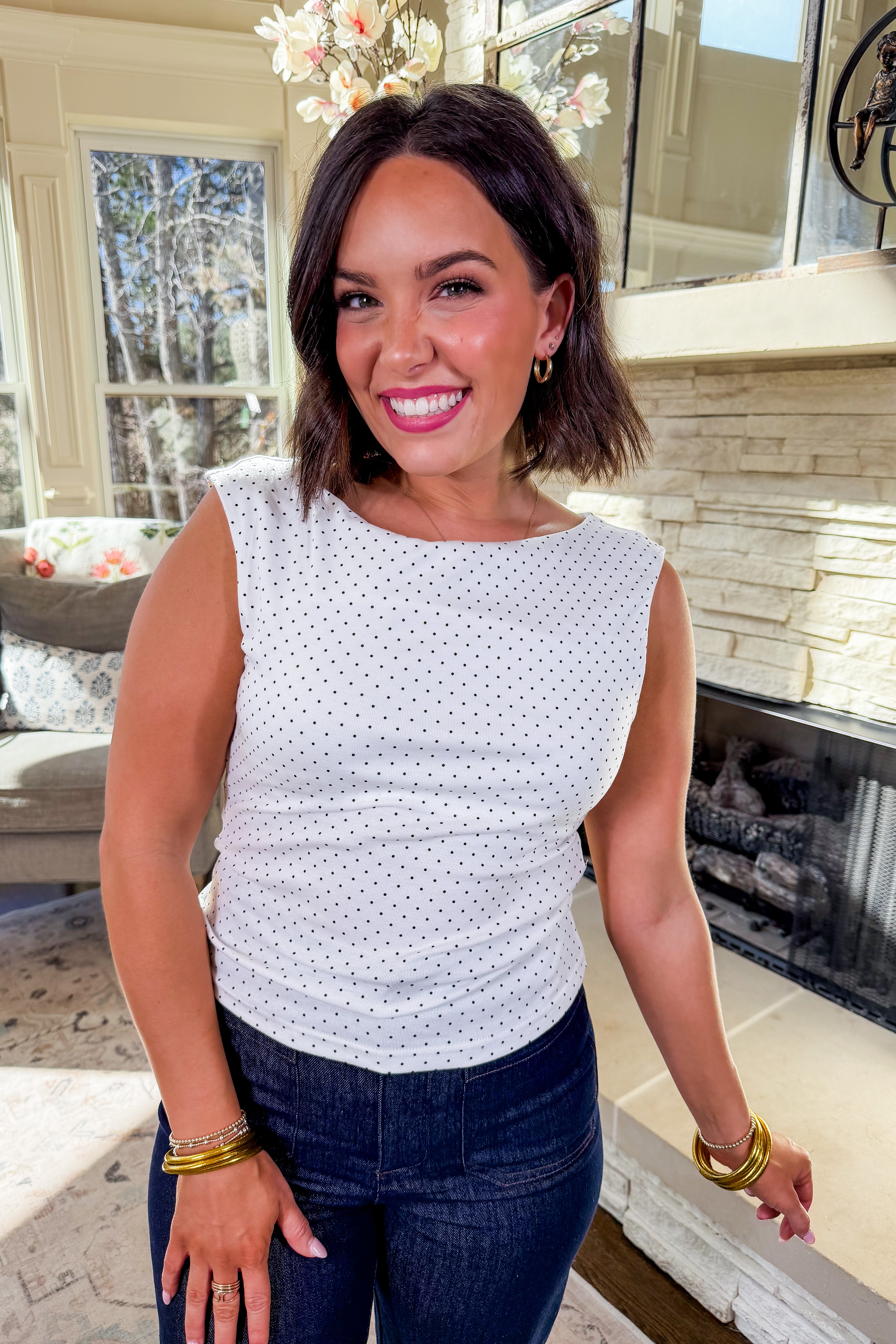 Classic and effortlessly refined, The Timeless Dot Top is a versatile staple designed for everyday elegance. Featuring a delicate dot pattern on a soft ivory base, this sleeveless top offers a clean, streamlined silhouette that’s easy to wear and simple to style. Lightweight and comfortable, it transitions seamlessly from workdays to weekends, making it a piece you’ll reach for season after season.
